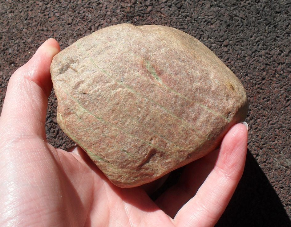 Dieser Stein gefiel mir gleich. Er ist ziemlich groß, fühlt sich aber weich und glatt an. Seine Struktur ist sehr fein und schnurgerade - unterbrochen von grünen Linien, die fast rechtwinklig seine eigenen Schichten schneiden.