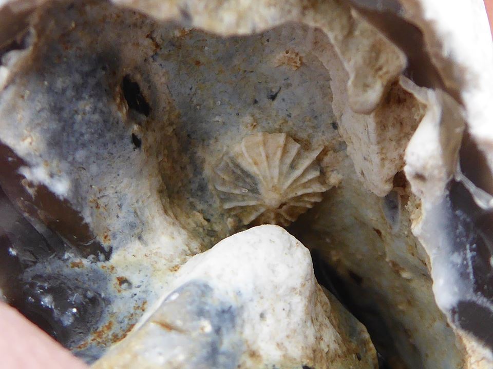 Hier noch einer, den ich mitnahm weil ich die Farben und rundgeschliffenen einzelnen Kristalle nett fand, erst jetzt gesehen dass er Spuren von Korallen hat