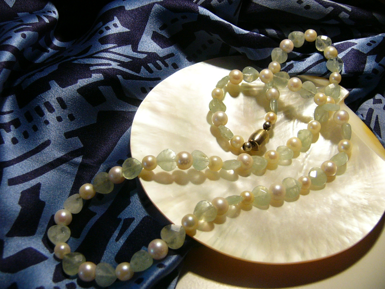 Hier eine Kette mit Prehnit 2 Citrine und Bergkristall Kugeln klein und 2 Linsen und mittig 1 facettierte