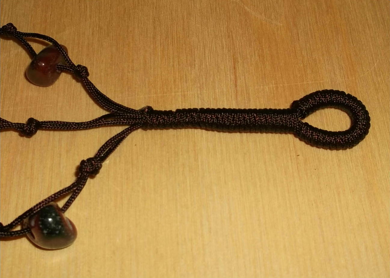 auf einem der 15´2cm Stücken wird ein Stein aufgefädelt und festgeknotet