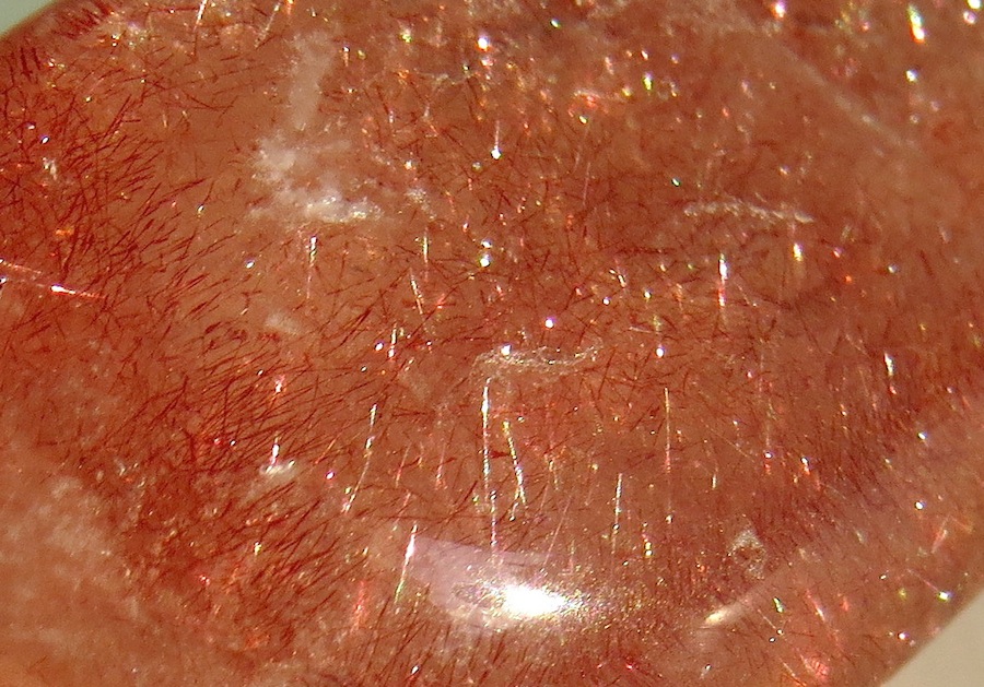 Diese roten "Fäden" glitzern auch gar nicht,das was glitzert sieht nach normalen hauchdünnen Rutilfasern aus,die da quasi nochmal extra drin sind.
