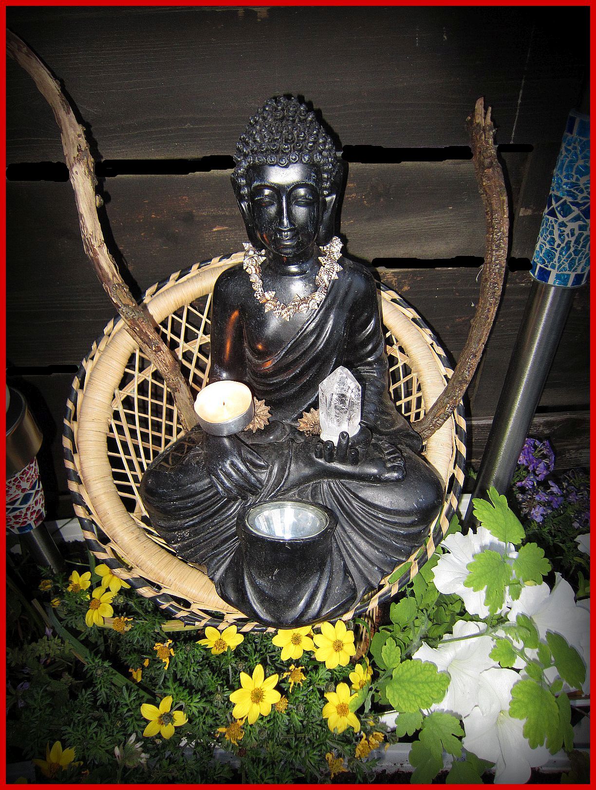 den Buddha für 5 Euro vom Baumarkt gehandelt, weil der Solarfühler beklebt war an dem Ausstellungsstück, und man dachte, er würde eh nicht strahlen.