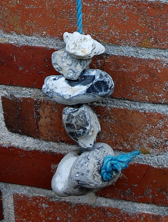 Ja, ich hab vor einigen Jahren auch mal welche hingehängt, daneben ist treibholz aus dem dänischen nachtlagerhaus, das fiel aber nach einem sommer schon auseinander, hab ich grade auf draht neu gefädelt und die muscheln derweil an die hühnergötter gehängt.