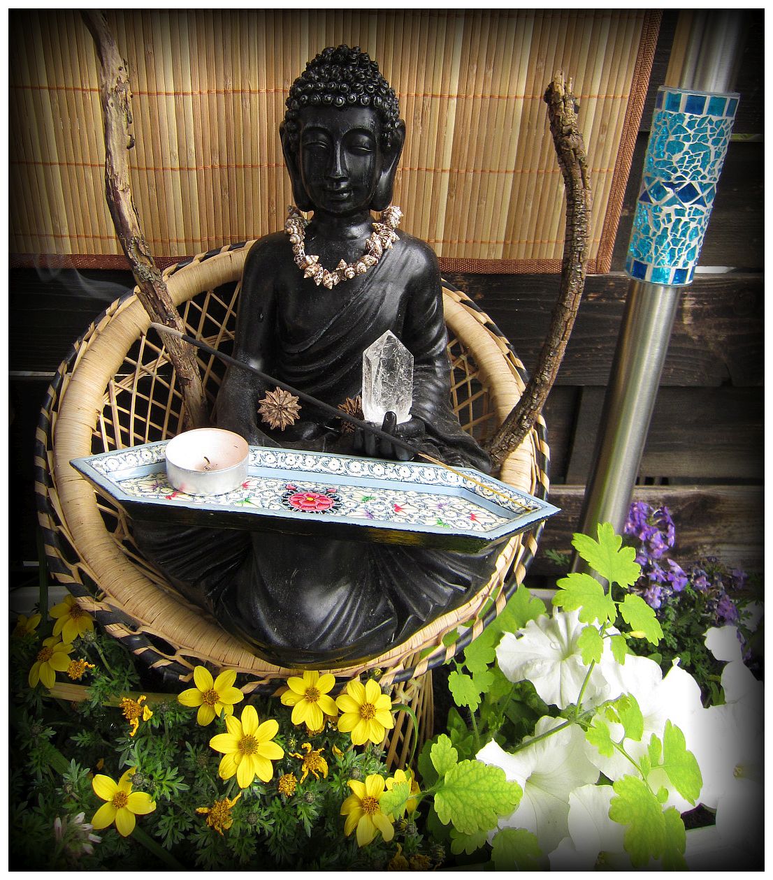 den Buddha für 5 Euro vom Baumarkt gehandelt, weil der Solarfühler beklebt war an dem Ausstellungsstück, und man dachte, er würde eh nicht strahlen.