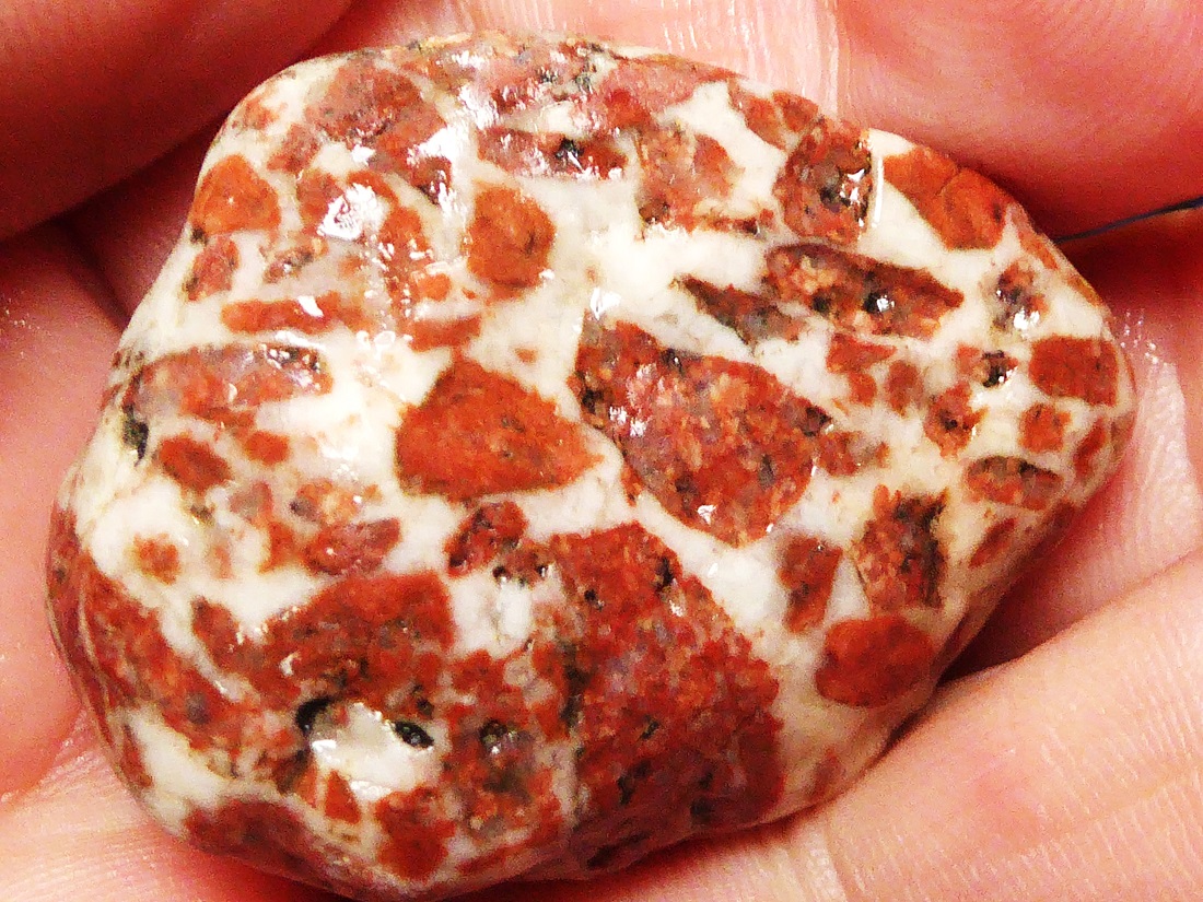 grüner Plagioklas, Biotit und hellrote Kalifeldspäte