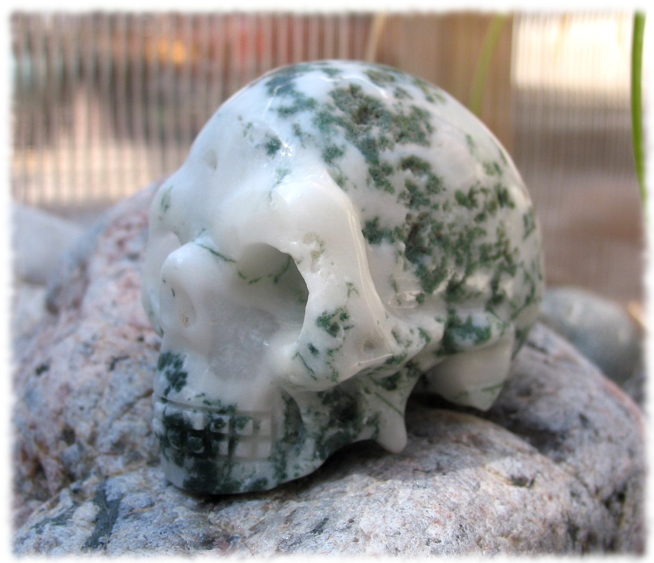 Ist eigentlich nicht wirklich ein Achat eher ein Chalcedon weiß undurchsichtig und mit hellgrünen bis dunkelgrünen Astähnlichen Einlagerungen, daher auch der Name.