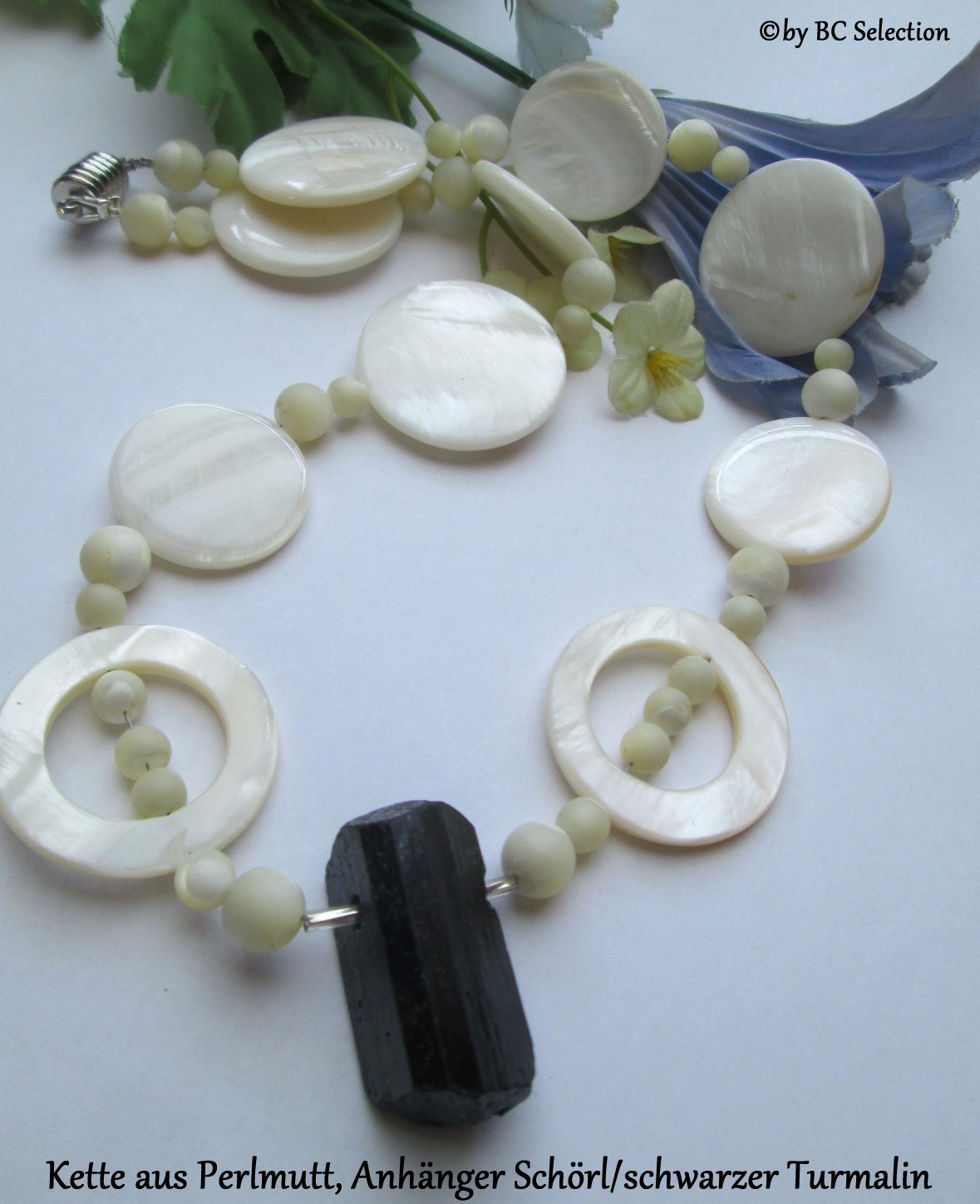 Perlmutt war eine Kette vom Flohmarkt, ebenso der Schörl-Anhänger. Die Kette habe ich aufgemacht und zusammen mit dem Schörl was neues kreiert. Hier ist das Ergebnis.