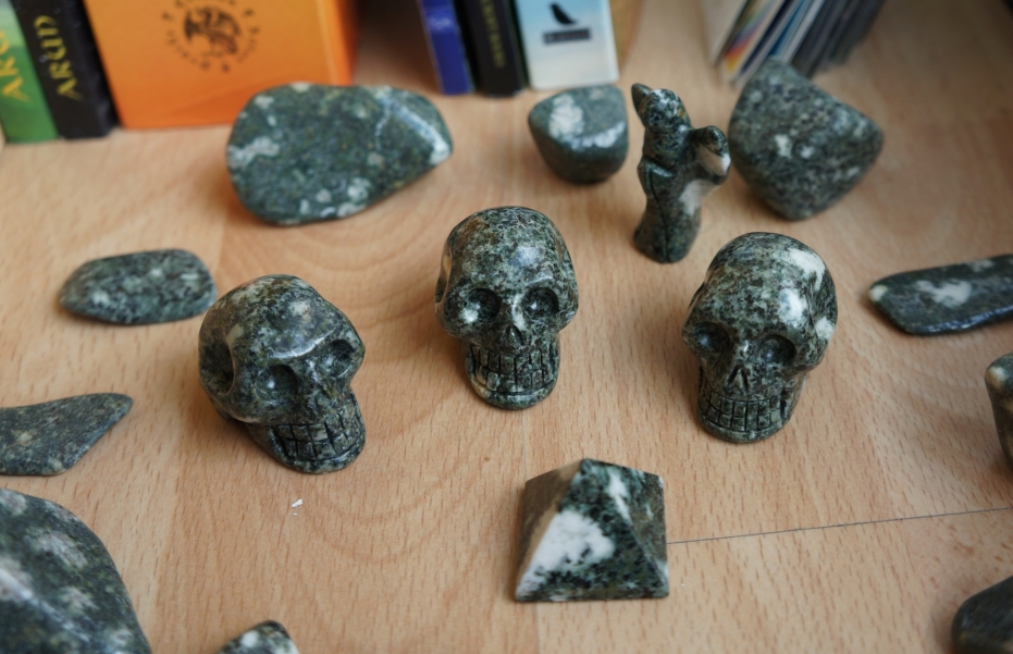 Heliotrop hatte ich auch noch nicht als Schädel gesehen, deshalb musste der gleich mit. Und ja, die Mama ist versteinerte Koralle. Kam mal als Riesenüberraschung von einer lieben Forine und hat die Stelle des Familienoberhaupts übernommen.