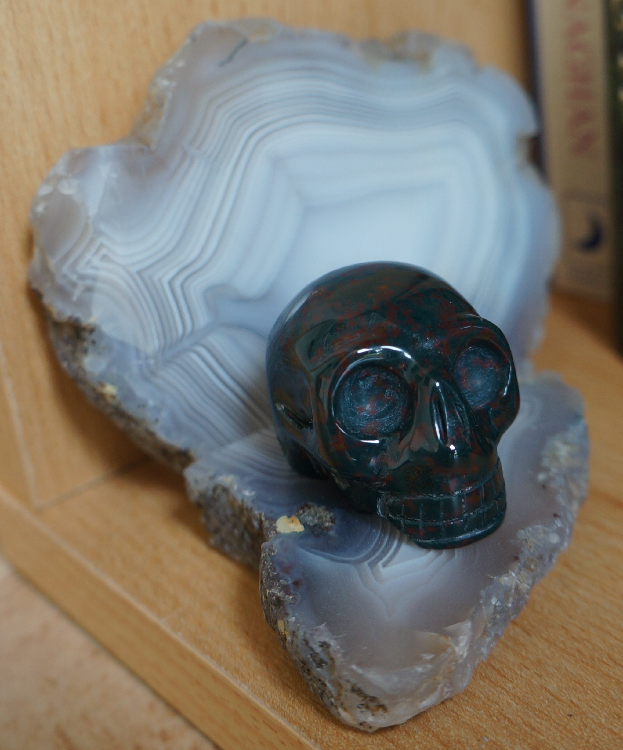 Heliotrop hatte ich auch noch nicht als Schädel gesehen, deshalb musste der gleich mit. Und ja, die Mama ist versteinerte Koralle. Kam mal als Riesenüberraschung von einer lieben Forine und hat die Stelle des Familienoberhaupts übernommen.