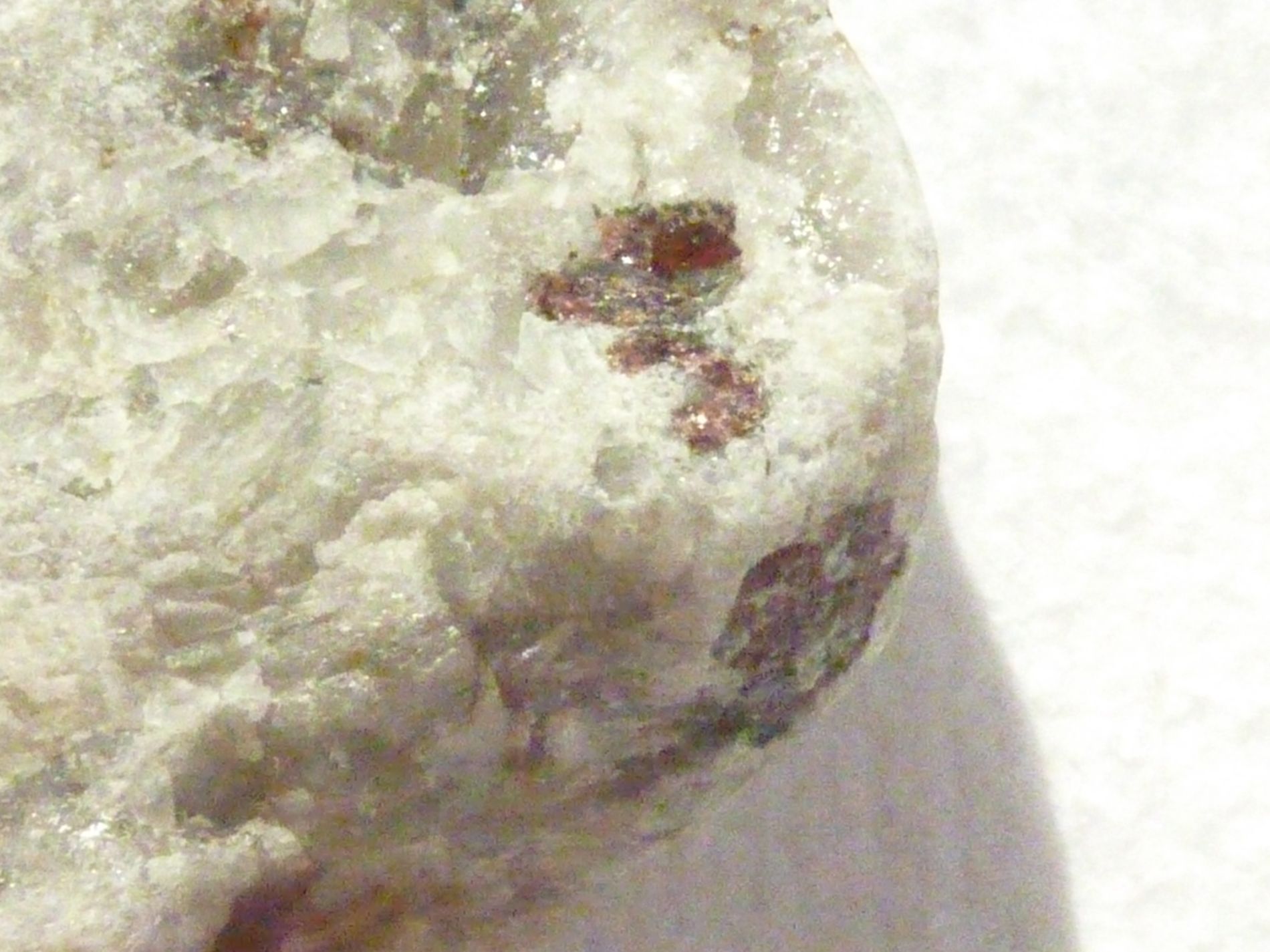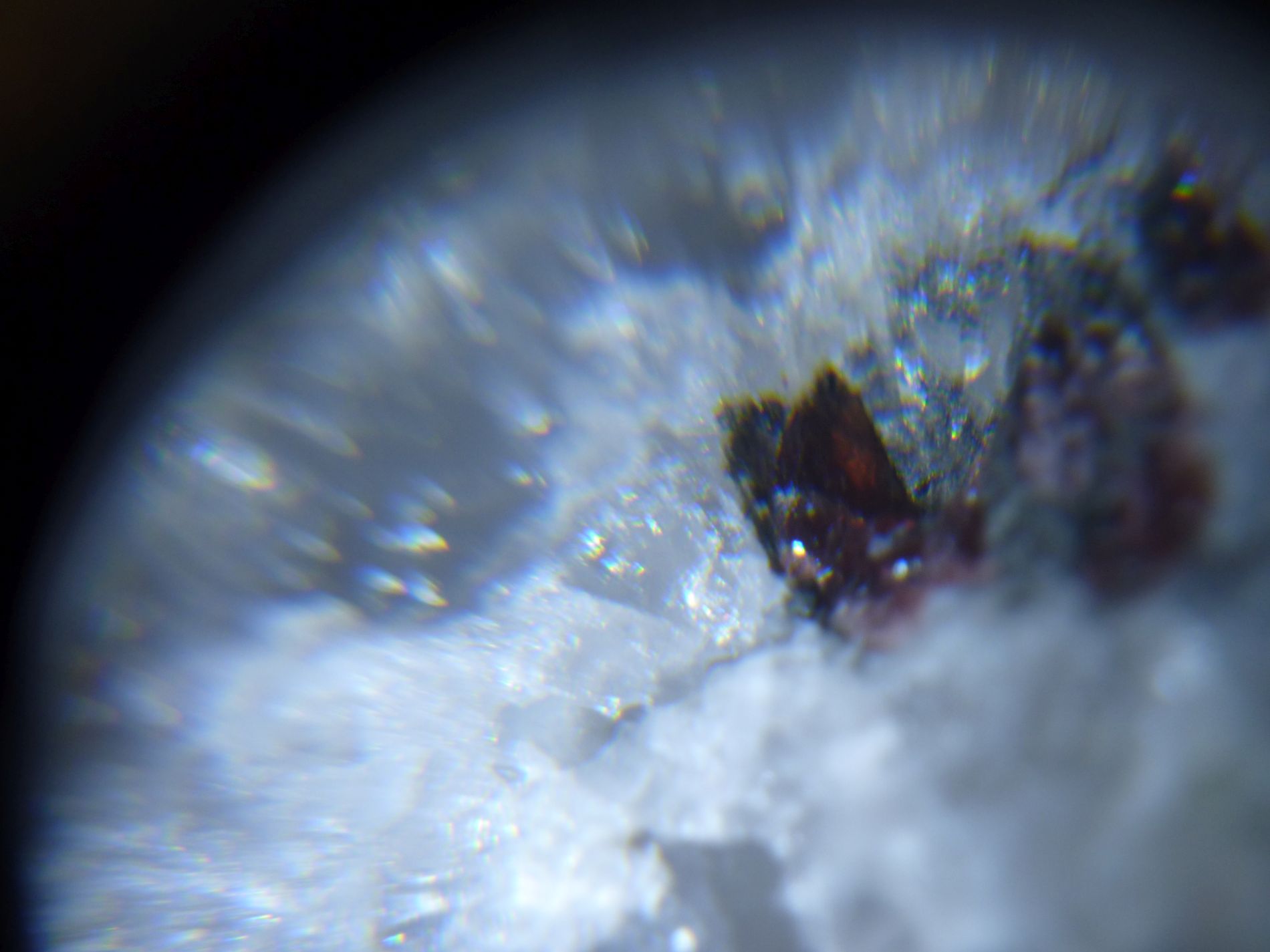 Es ist ein winziger, mit den Augen nur als roter Fleck sichtbarer, Granatkristall (glaube ich zu mindest) in Quarz.