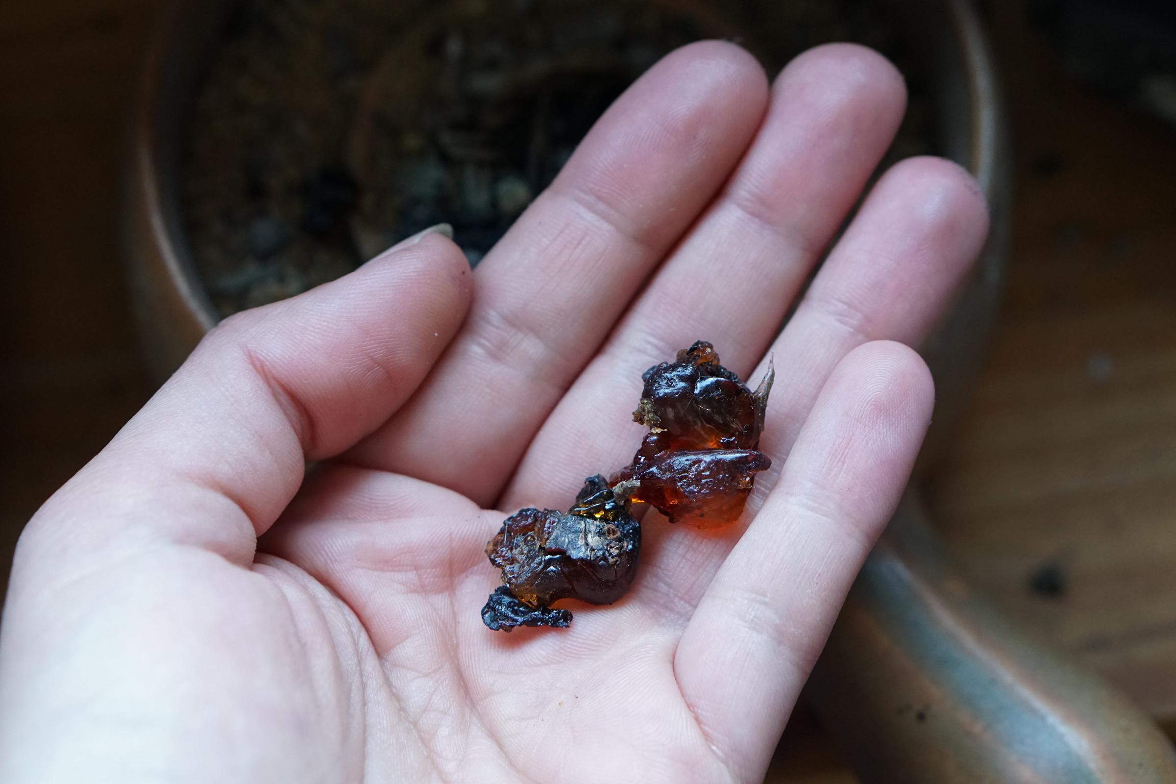 Vor ein paar Tagen habe ich Harz von einer Wildkirsche gesammelt. Viel ist nicht mehr übrig ;-)