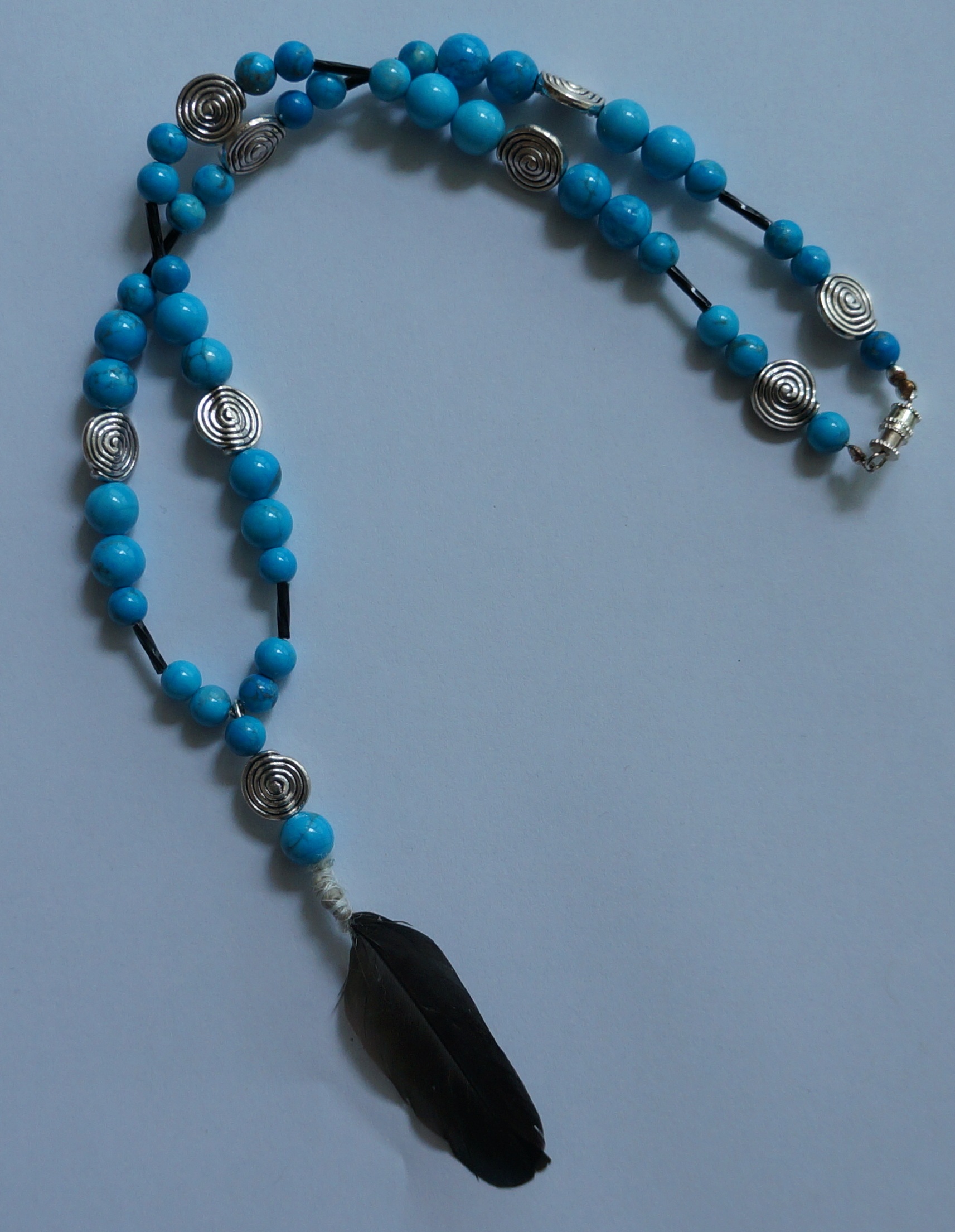 schamanisch - mit Feder von einer lieben Forine und gefärbtem Magnesit (eigentlich mag ich so gefälschte Dinge ja nicht, aber die Farbe ist in Natura toll. Da hab ich mir den Strang ganz bewusst gekauft)