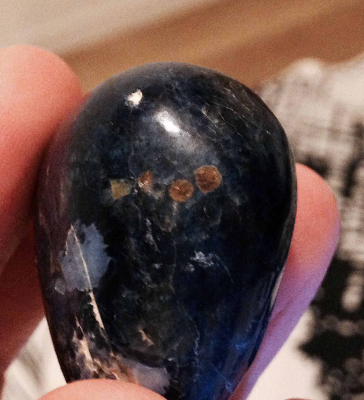 Ich habe den hier als Dumortierit gekauft, bin nun aber unsicher, wegen den andersfarbigen Stellen. (Gelb/orange Punkte und hellblaue Stelle)