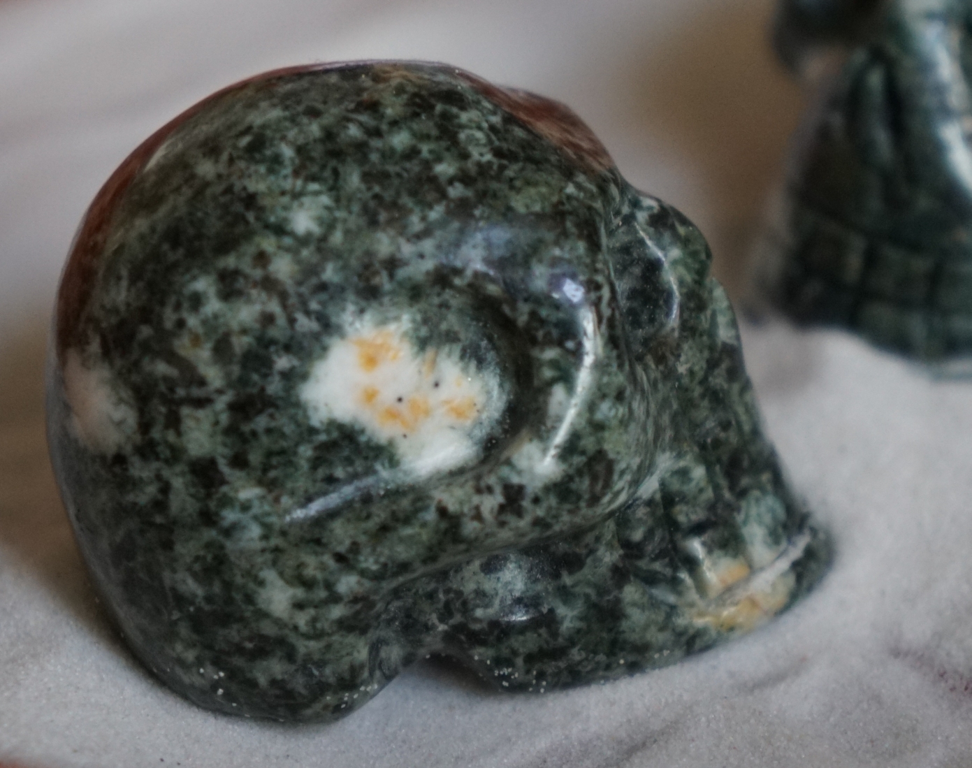 ein Massagestab (noch nicht ausprobiert) kleine Pyramide (zum Beispiel für den Nachttisch. Aber vorsicht! Der Preseli räumt nachts so richtig auf und sorgt für unruhigen Schlaf. Nicht länger als 2 Nächte am Stück arbeiten lassen) große Handschmeichler (gut geeignet für Meditationen - dazu in die Hand nehmen oder Steinkreise damit legen) Guinevere und Armeth zeigen, dass Preselis mal viele große weiße Flecken haben und manchmal fast keine Taliesin hat sogar gelbe Flecken Armeth und Tybalt - nochmal ein paar Varianten Mini-Steinkreis für die Energie im Raum. Mit 4 großen Handschmeichlern kann man schon einen prima Steinkreis legen und sich selbst in die Mitte setzen.