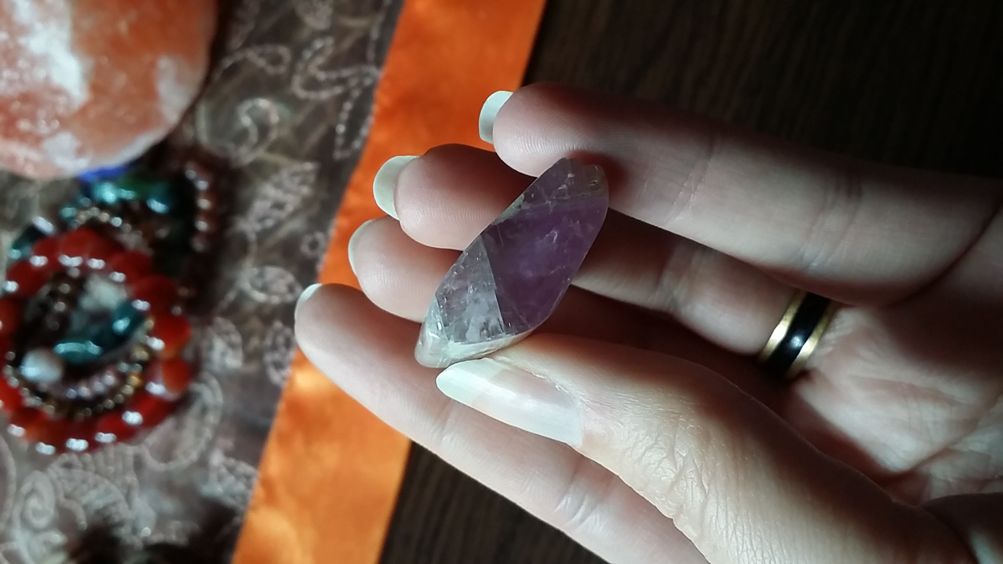 Reinigung: 1x monatlich unter Fließwasser, aufladen im Vollmond oder in einer Amethystdruse.