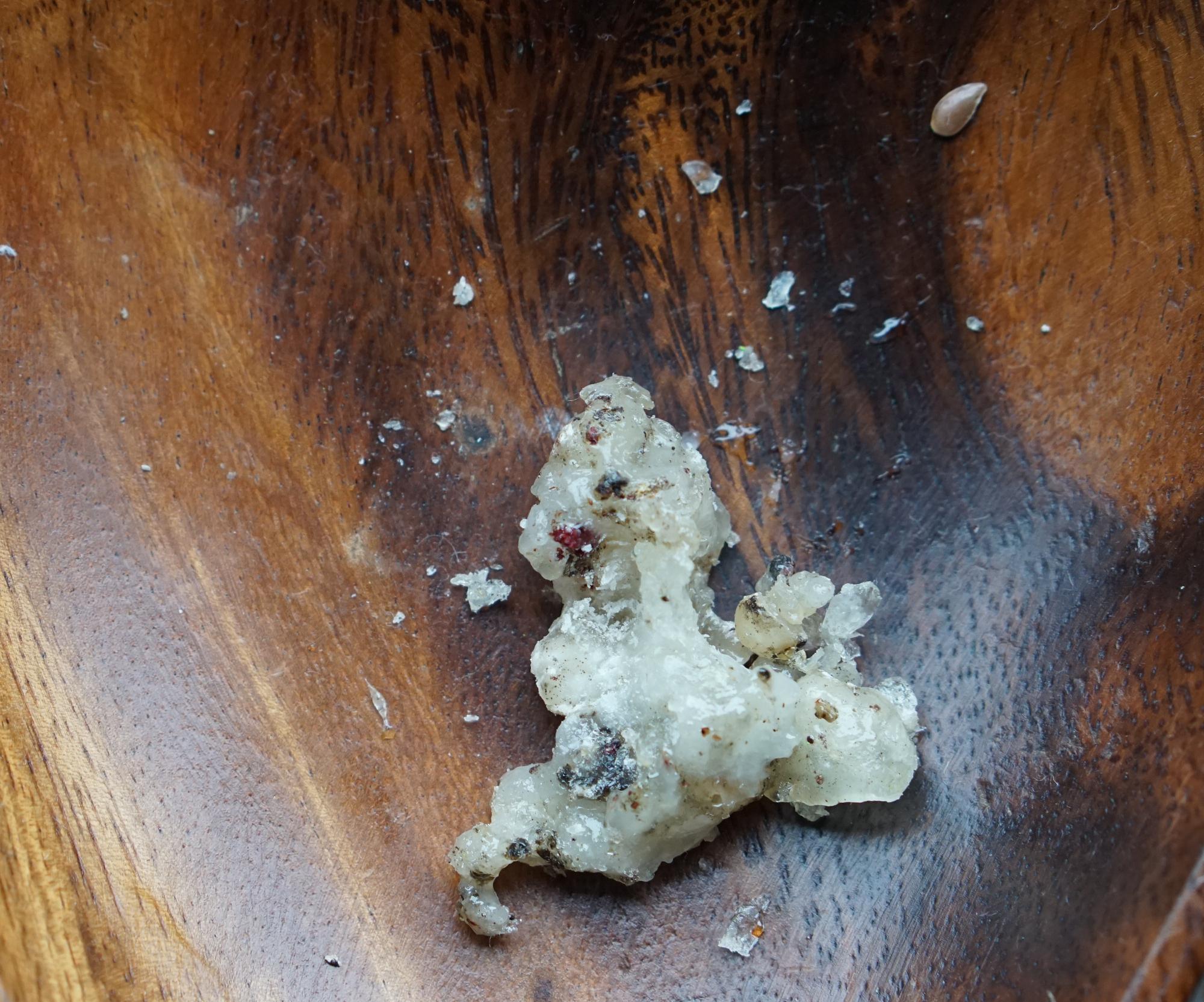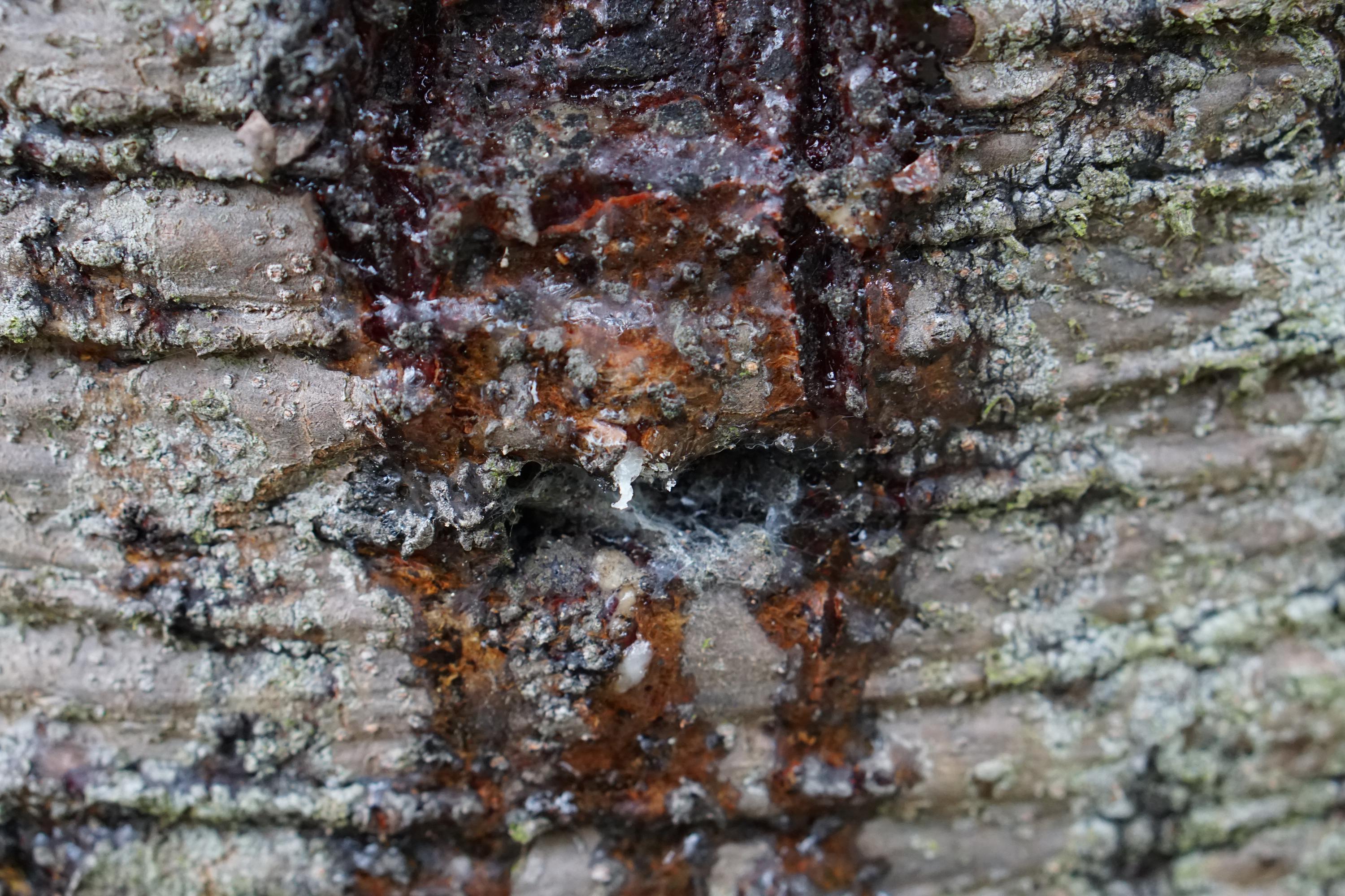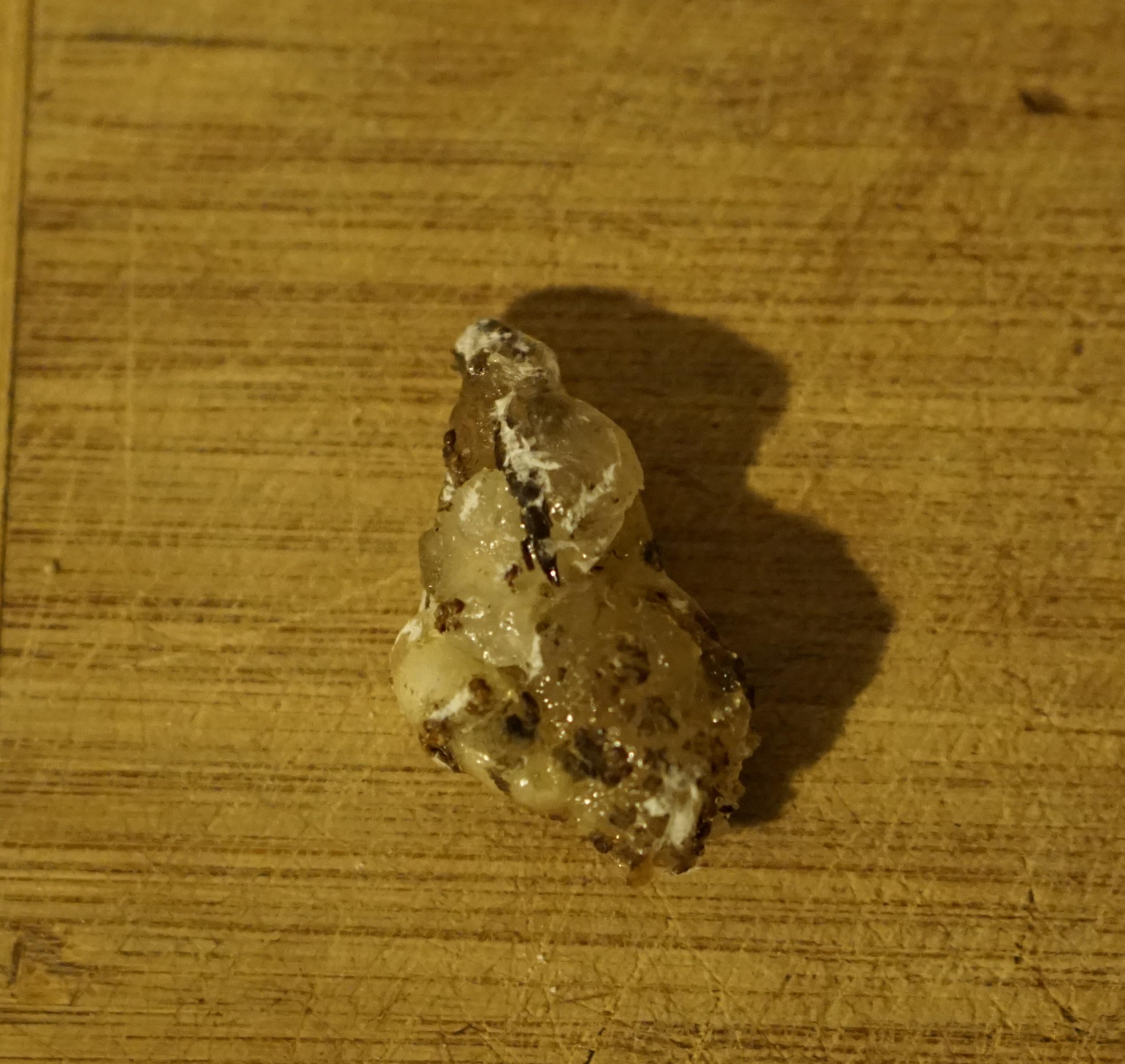 Das gealterte Harz von diesen Bäumen ist dunkel Braun und steinhart. Mein Mann hat zwei Messer zerstört und es nicht ab bekommen. Man müsste eine Axt nehmen. Was wohl der Besitzer sagen würde?