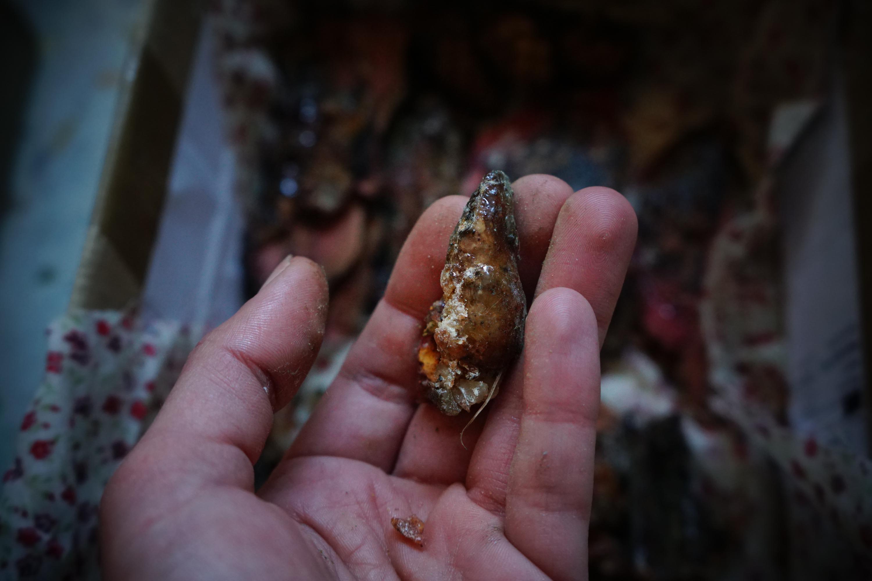 Fichte, große alte Brocken Lärche-Träne An dieser Lärche gab es relativ viel Harz. Ein paar abgeplatzte Rindenstücke mit trockenen harten Harz. Aber auch frisches Harz. Das trockene bekam man kaum ab. Meine Beute, links Fichte, rechts Lärche ...das war ein guter Tag