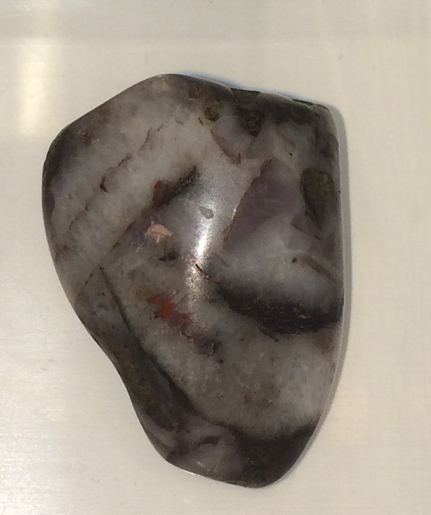 Es gibt Amethyste mit Hämatitüberzug, diese Steine sind teilweise sehr durchmischt und enthalten auch weißen oder grauen Quarz. Je nachdem, von wo ein Trommelstein aus so einem Brocken oder bessergesagt aus so einer Stufe kommt (die Kristalle sind meist zusammengewachsen, nicht einzeln isoliert), kann alles dabei sein.