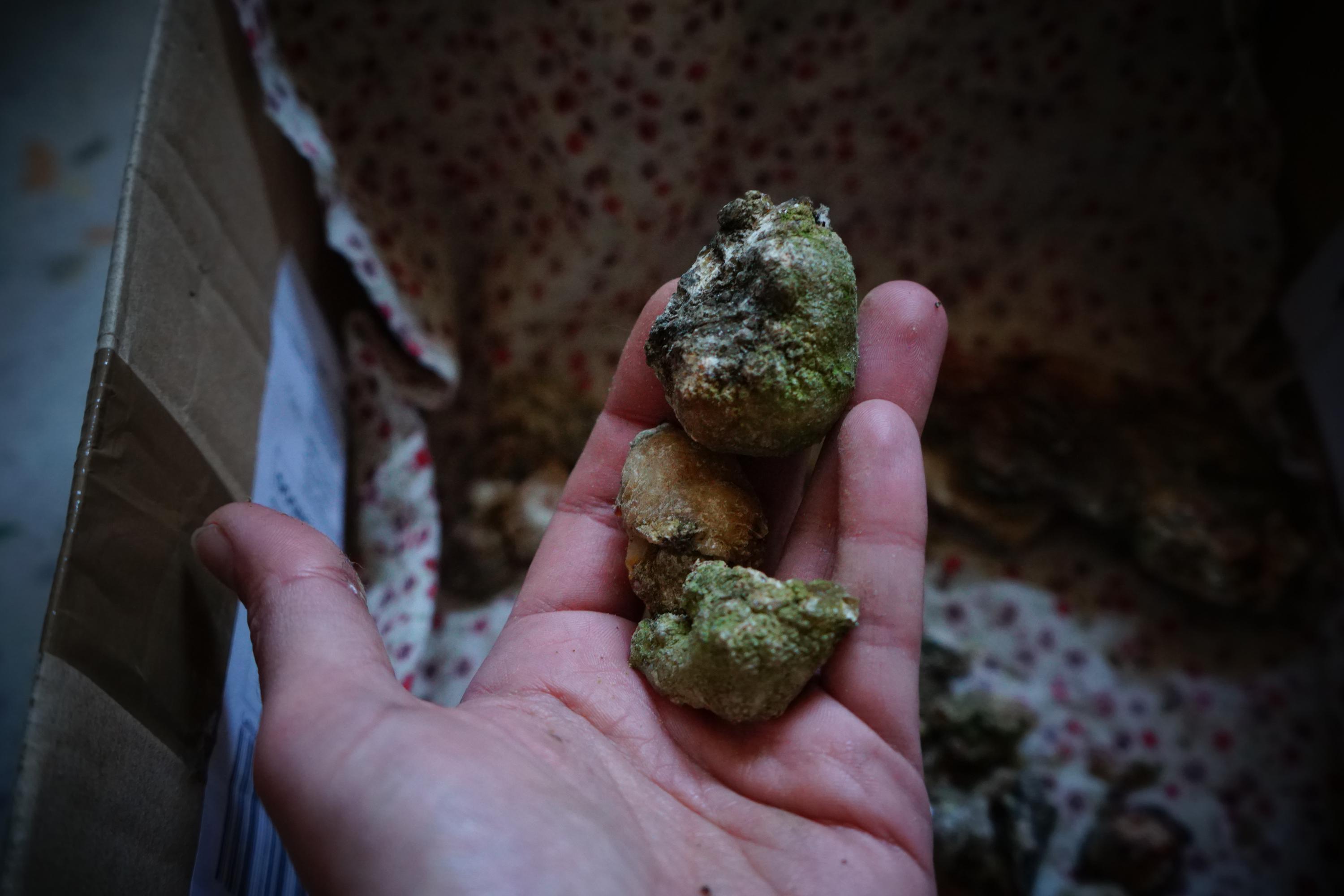 Fichte, große alte Brocken Lärche-Träne An dieser Lärche gab es relativ viel Harz. Ein paar abgeplatzte Rindenstücke mit trockenen harten Harz. Aber auch frisches Harz. Das trockene bekam man kaum ab. Meine Beute, links Fichte, rechts Lärche ...das war ein guter Tag