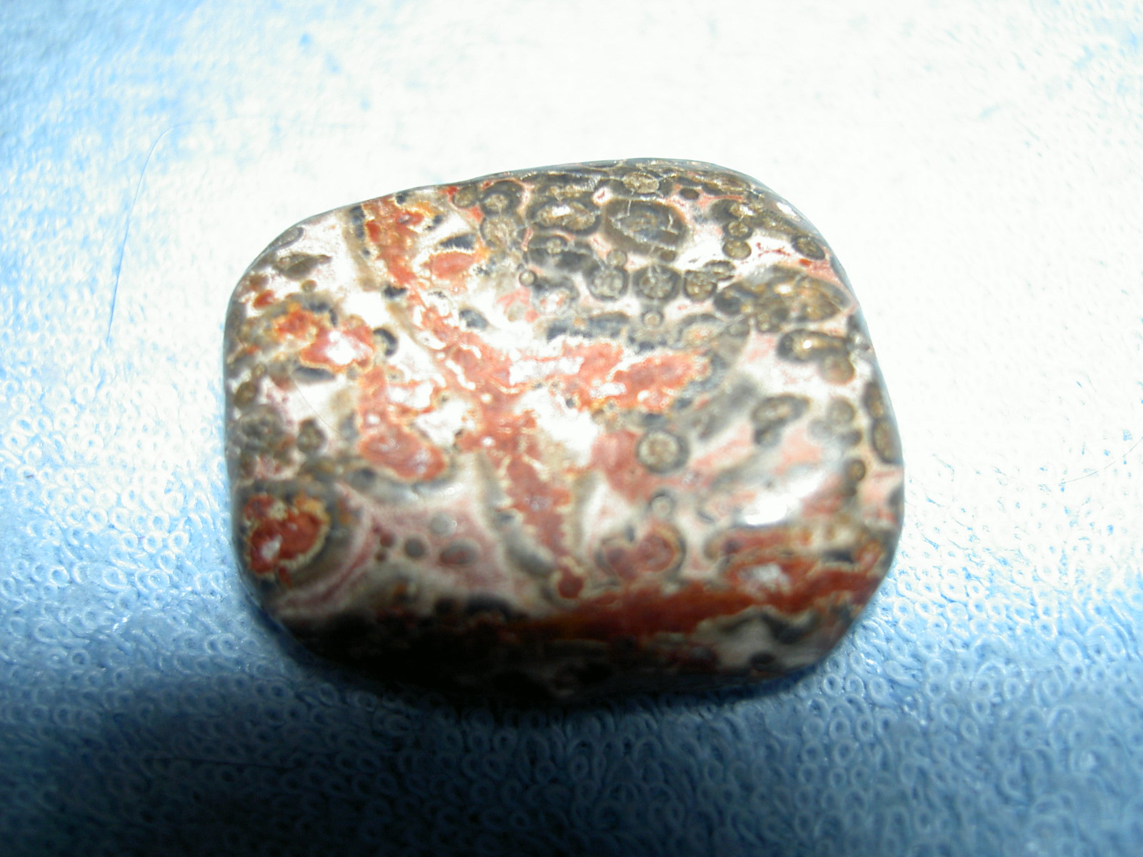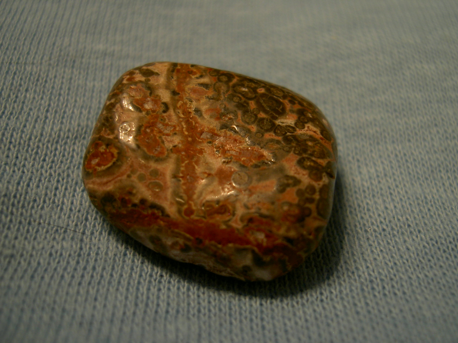 Ja auch Leopardenjaspis genannt, ist ein Rhyolith, ist hauptsächlich rosa oder beige in der Grundmasse, kann aber auch schon mal andere Farben haben, Braun oder gelb z.B.und auch grünlich. Erinnert euch an einige Spruchbilder von mir, das waren Leopardenjaspise.