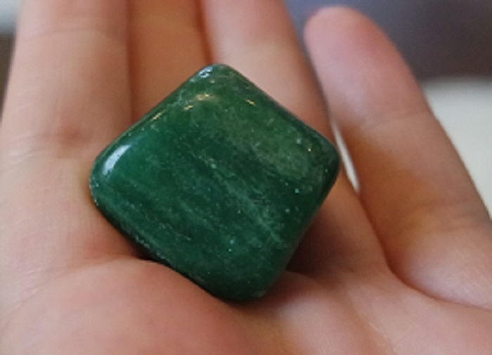 Vom Glitzern her und von der Tatsache, dass der Stein aus einer Schüssel zum Aussuchen war (soll nicht abwertend sein, aber bei solchen Schüsselchen sind doch eher die "alltäglichen" Steine zu finden), würde ich auch auf grünen Aventurin tippen.