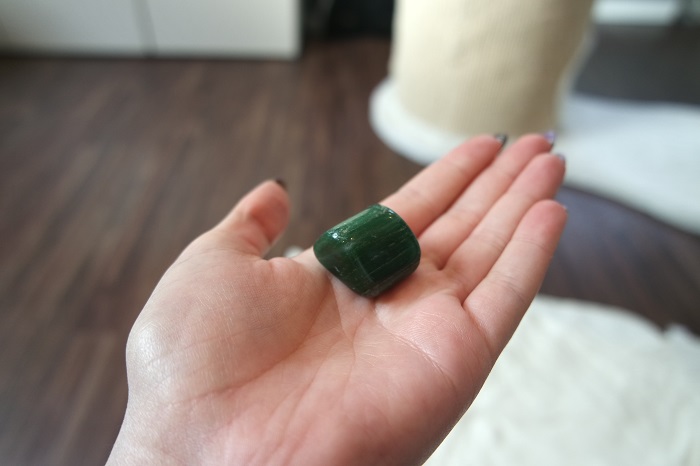 Vom Glitzern her und von der Tatsache, dass der Stein aus einer Schüssel zum Aussuchen war (soll nicht abwertend sein, aber bei solchen Schüsselchen sind doch eher die "alltäglichen" Steine zu finden), würde ich auch auf grünen Aventurin tippen.