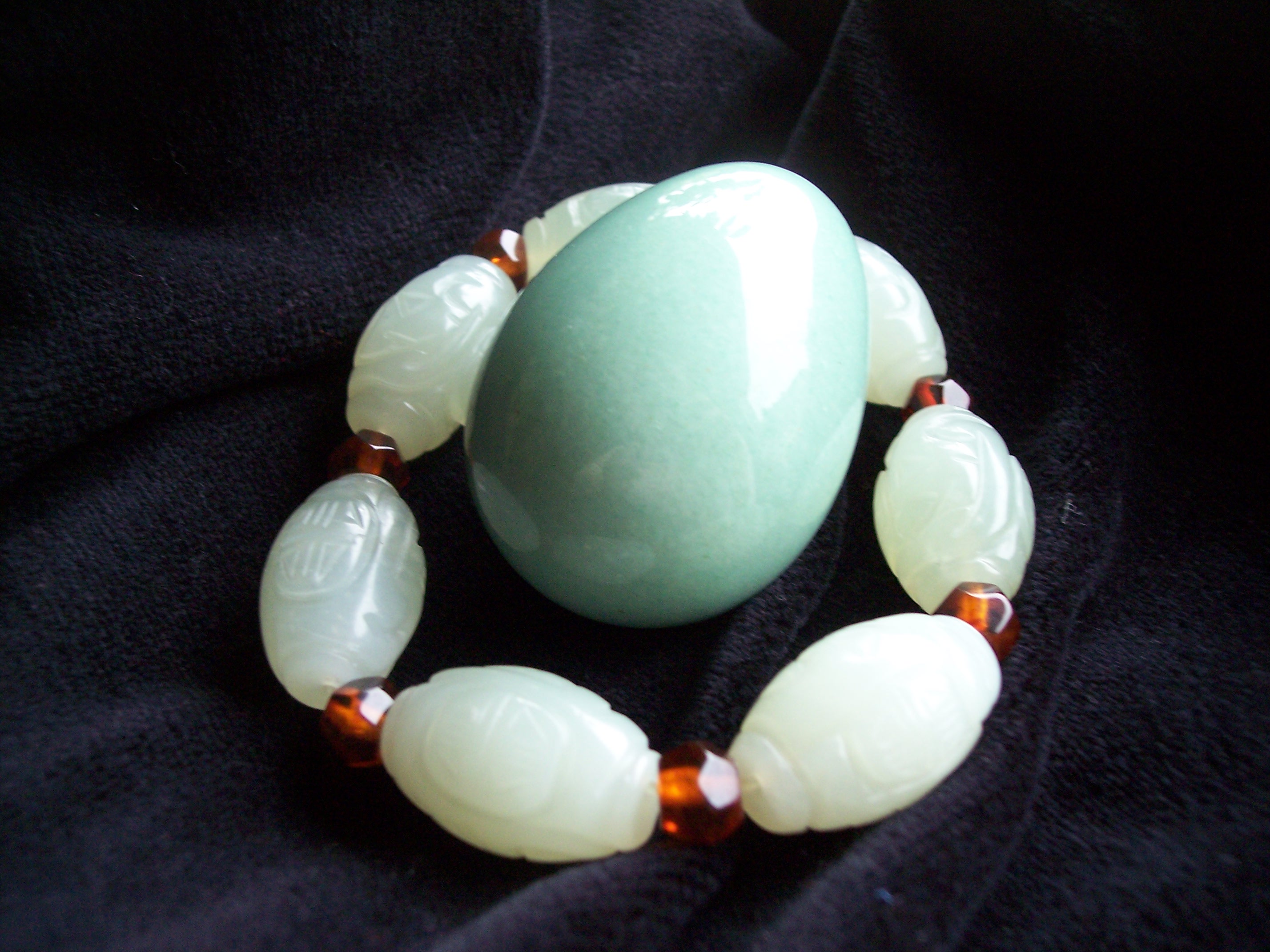 Hier habe ich ein Foto bei Tageslicht mit meinem Serpentin-Armband. Das Armband ist lauchgrün und auch der Stein ist kräftiger grün. Die Fototechnik "schluckt" bei Tageslicht die Grünanteile.