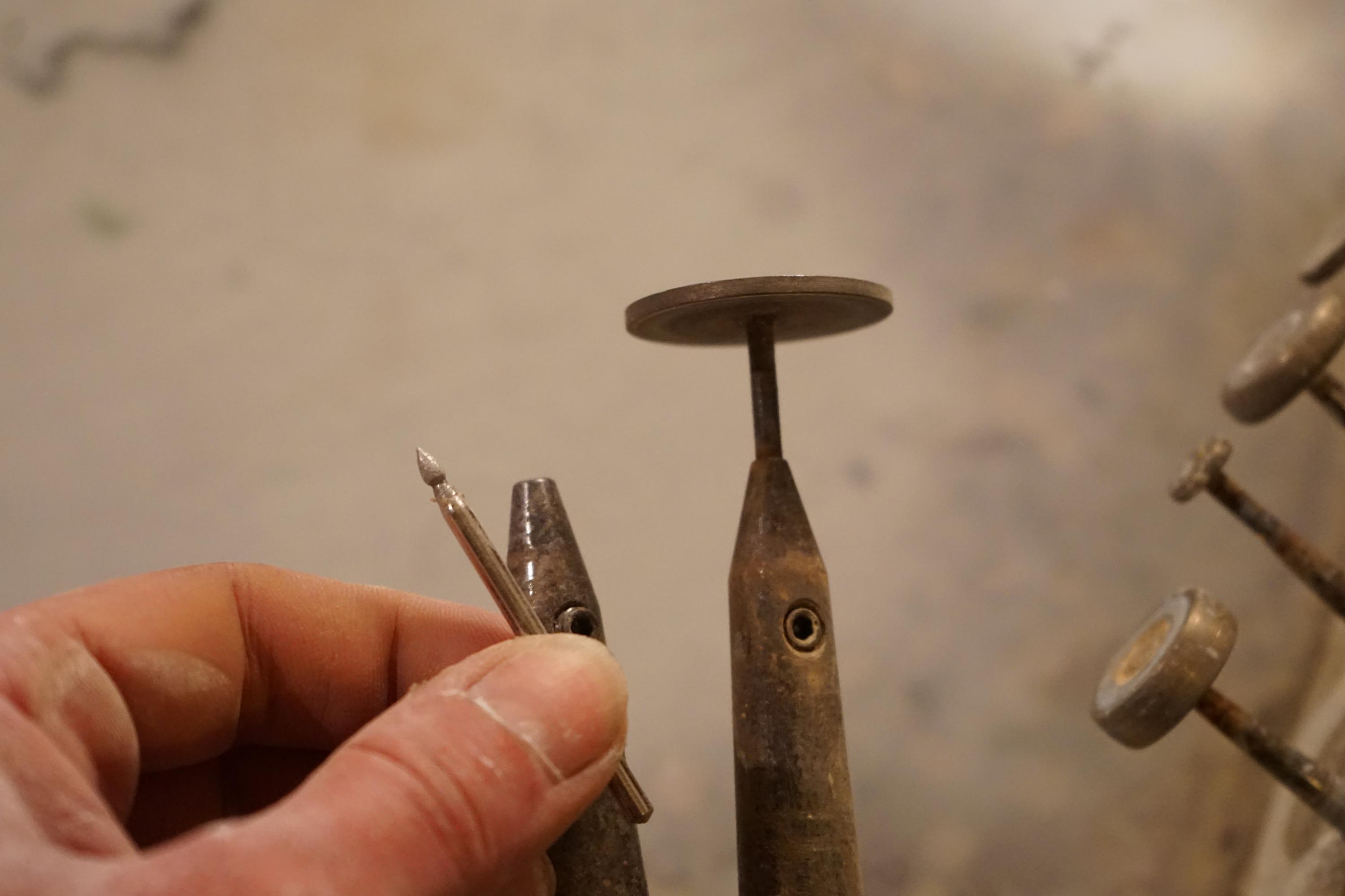 Dies sind Spindeln die variabel sind, dort kann man kleinere Rädchen einspannen. Hier habe ich galvanisierte Rädchen. Da wird nur eine dünne Schicht Diamantkorn auf ein vorgefertigtes Profil aufgebracht und sind deshalb auch nicht so langlebig.