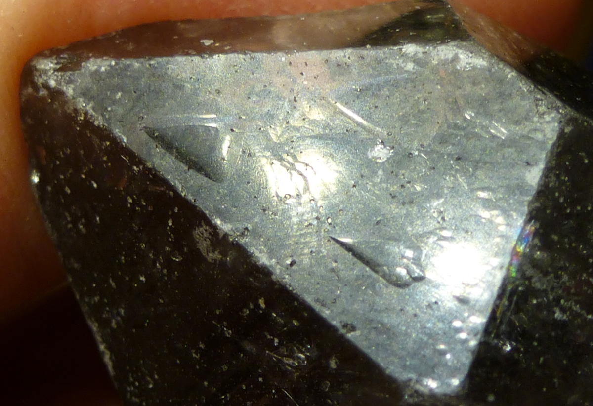 Man sieht unter einer der glatten mattglänzenden Prismen flammenartige Strukturen die nach oben steigen. Das sind mit Flüssigkeit und Gas gefüllte Fahnen. Sie manifestieren sich als kleine Vizinalflächen auf der Oberfläche der Rhomboederfläche, in die sie sichtbar hinüberziehen, etwas von der mehrdimensionalen Unordnung, oder von etwas was nicht geordnet war aus dem Inneren des Kristalls, sozusagen dort speichernd.