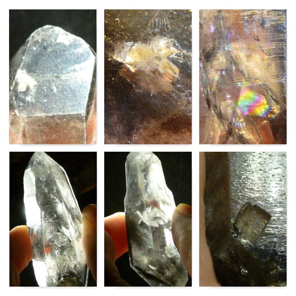 Man sieht unter einer der glatten mattglänzenden Prismen flammenartige Strukturen die nach oben steigen. Das sind mit Flüssigkeit und Gas gefüllte Fahnen. Sie manifestieren sich als kleine Vizinalflächen auf der Oberfläche der Rhomboederfläche, in die sie sichtbar hinüberziehen, etwas von der mehrdimensionalen Unordnung, oder von etwas was nicht geordnet war aus dem Inneren des Kristalls, sozusagen dort speichernd.