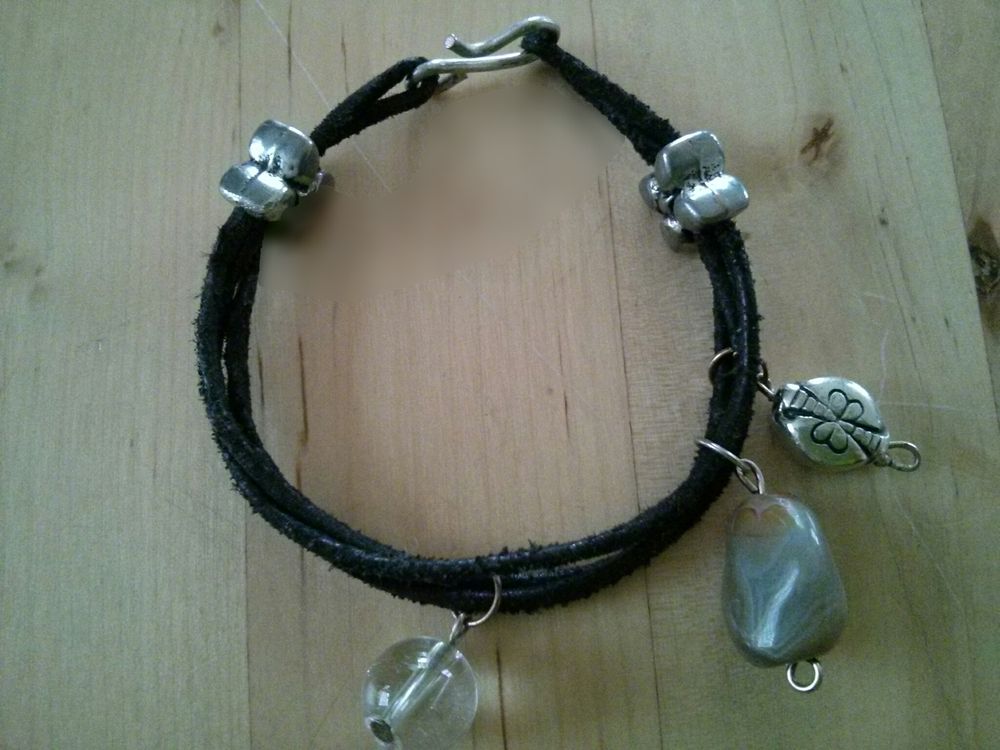 selbstgebasteltes Armband mit Achat und Bergkristallperle, den Trick mit dem Lederband kriege ich glaube ich heute nicht mehr hin, dreifach zwischen den beiden Sternzwischenteilen, kommen aus diesen jeweils in Richtung Verschluss nur zweifach raus