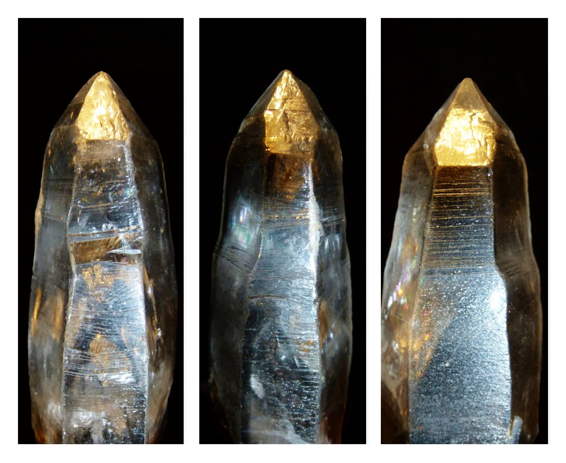 Man sieht unter einer der glatten mattglänzenden Prismen flammenartige Strukturen die nach oben steigen. Das sind mit Flüssigkeit und Gas gefüllte Fahnen. Sie manifestieren sich als kleine Vizinalflächen auf der Oberfläche der Rhomboederfläche, in die sie sichtbar hinüberziehen, etwas von der mehrdimensionalen Unordnung, oder von etwas was nicht geordnet war aus dem Inneren des Kristalls, sozusagen dort speichernd.