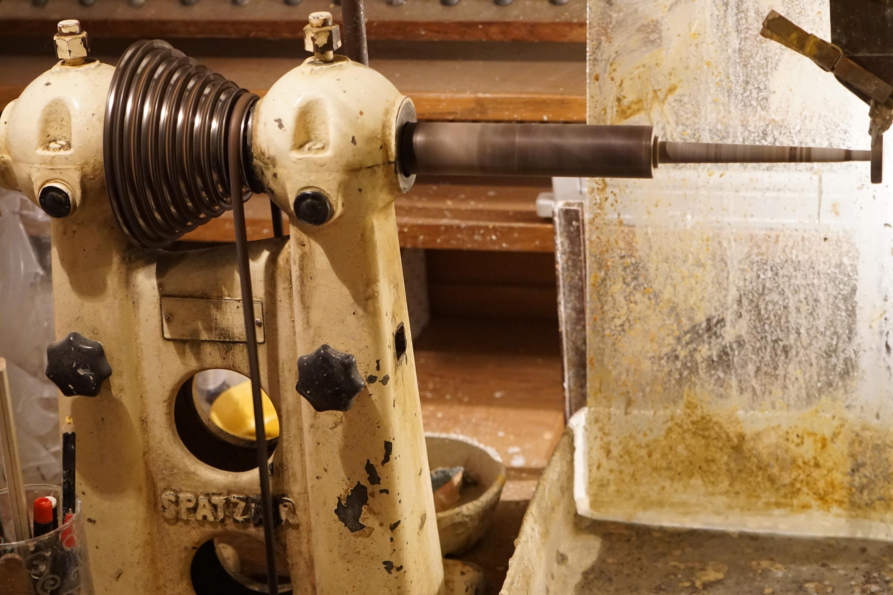 Über den Riemen kann man die Geschwindigkeit regulieren. Von Klein (schnell)3.300 bis ganz nach oben (langsam)500 U/M.