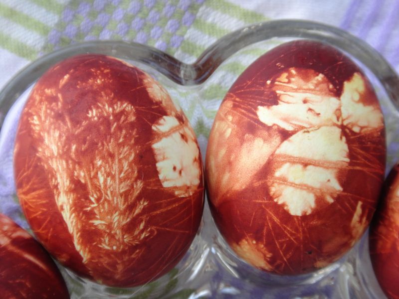 Normalerweise sammelt man ab Weihnachten die braunen trockenen Schalen der Zwiebeln und an Ostern hat man genug. Man muss die Schalen in einem großen Topf mit Wasser, etwas Salz, glaub ich, und Essig aufkochen. Dann wieder abkühlen lassen. Man sammelt schöne Gräser und Kräuter, eben alles, was ein schönes Muster geben kann. Dann wickelt man die Kräuter mit einem Faden fest um das rohe Ei. Die so umwickelten Eier gibt man dann in den Topf mit den ganzen Schalen und kocht sie wie man sie haben möchte. Wir kochen sie 5 Minuten. Dann rausfischen und noch heiß und feucht abwickeln, sonst bleiben die Schalen dran kleben. Aber Vorsicht, sie sind ja kochend heiß. :)