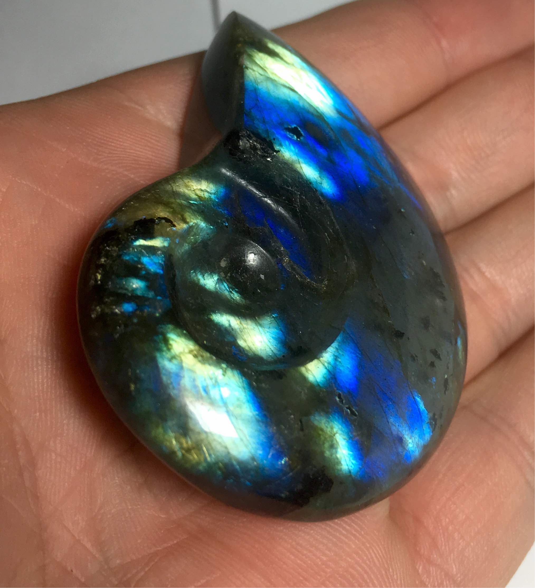 Und ein Labradorit in Form eines Ammoniten geschliffen.