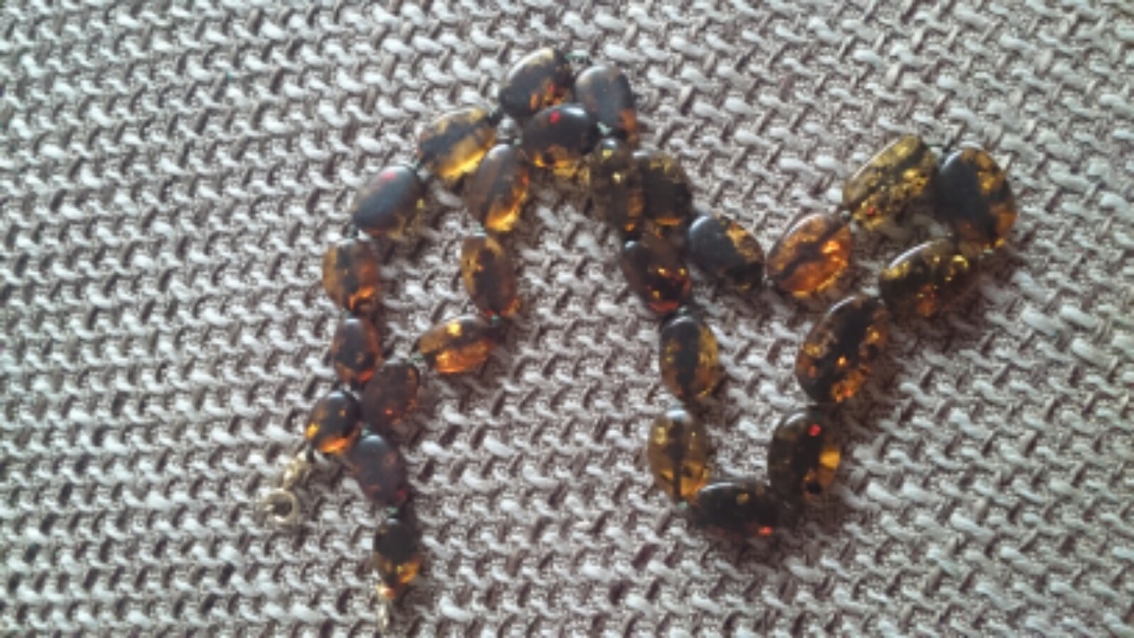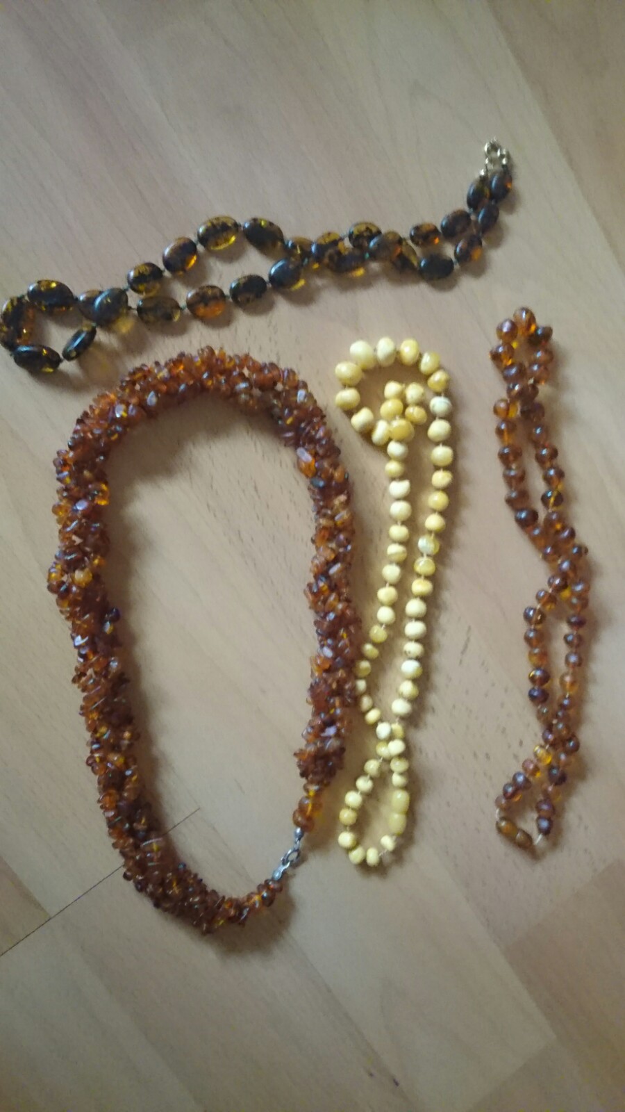 Die Bernsteinketten sind matt staubig und verklebt? Evtl. Cremereste, Hautfette ect. und lagen Jahre im Schmuckkasten.