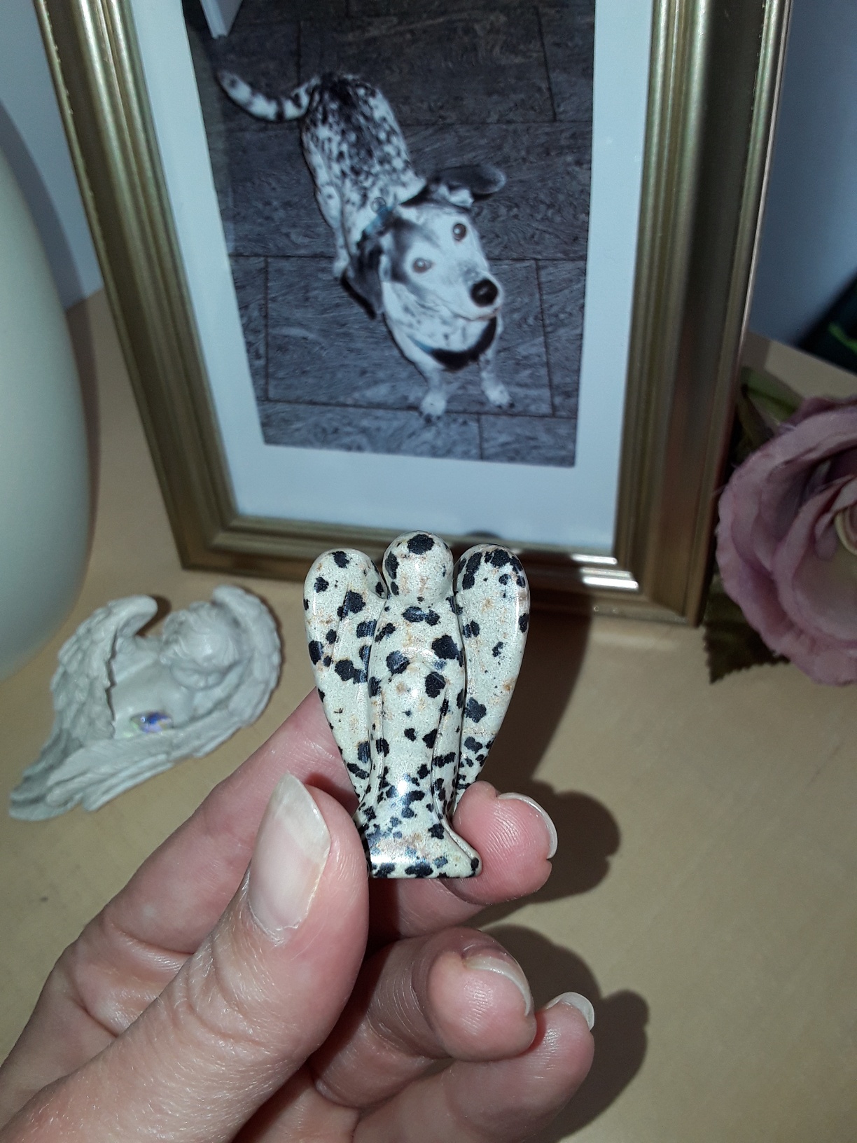 Ich kann leider bisher nur einen kleinen Engel für diese tolle Galerie beisteuern, aber dafür einen sehr geliebten mit besonderer Bewandnis. Normalerweise hätte ich mich bei einer Figur nicht für einen Dalmatiner Jaspis entschieden, aber in diesem Fall war es eine ganz klare Entscheidung wie ihr seht...