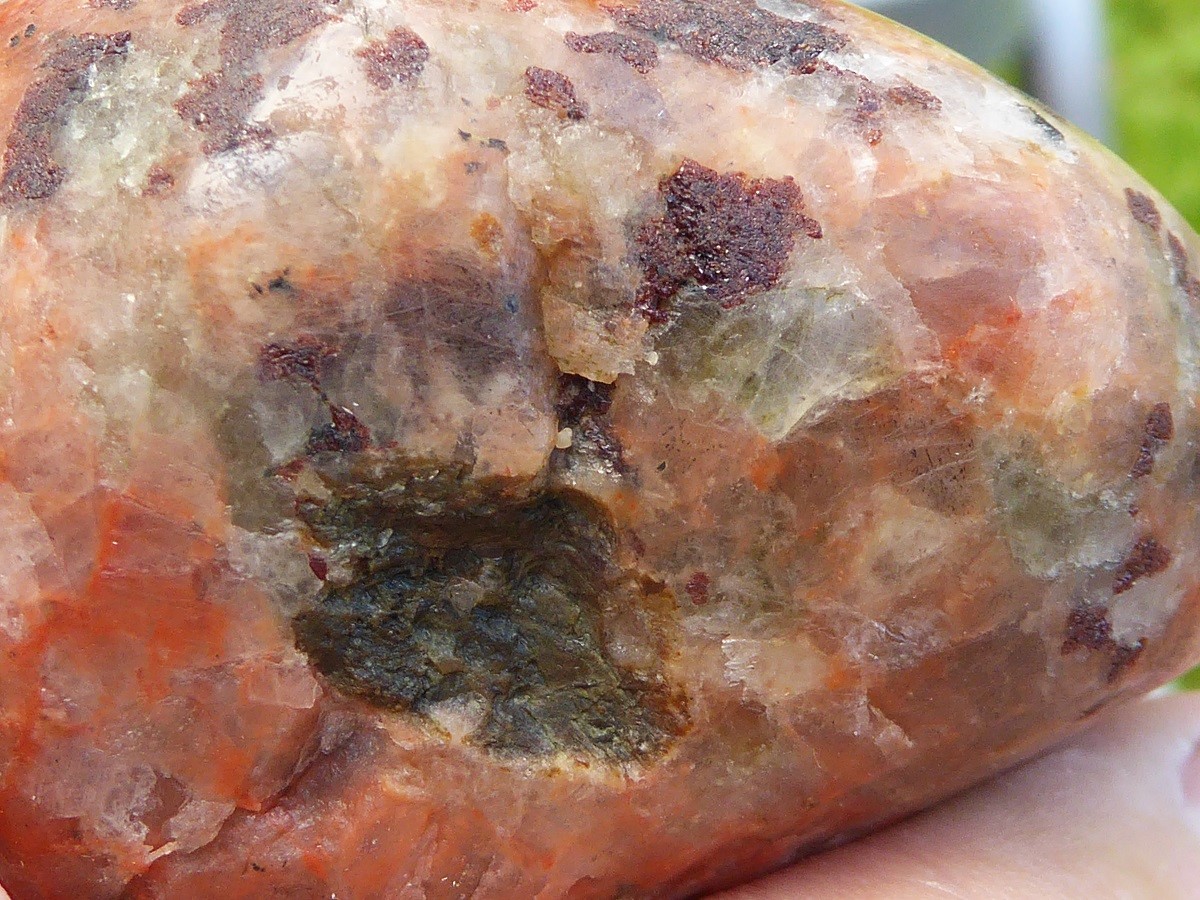 Und gestern diesen hübschen hab ich danach geschliffen und poliert. Würde mal sagen ein Pegmatit mit Granat? Theoretisch müsste ich ihn noch weiter schleifen, aber ich hab Angst das diese winzigen Granate rausbrechen, aber sie glänzen total schön.