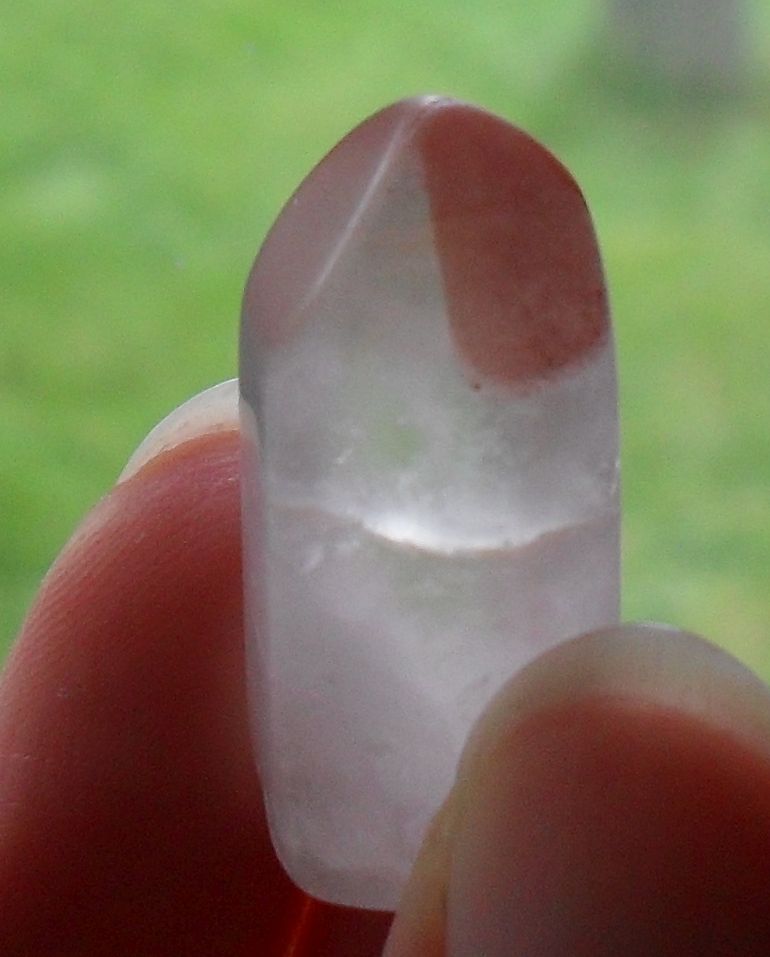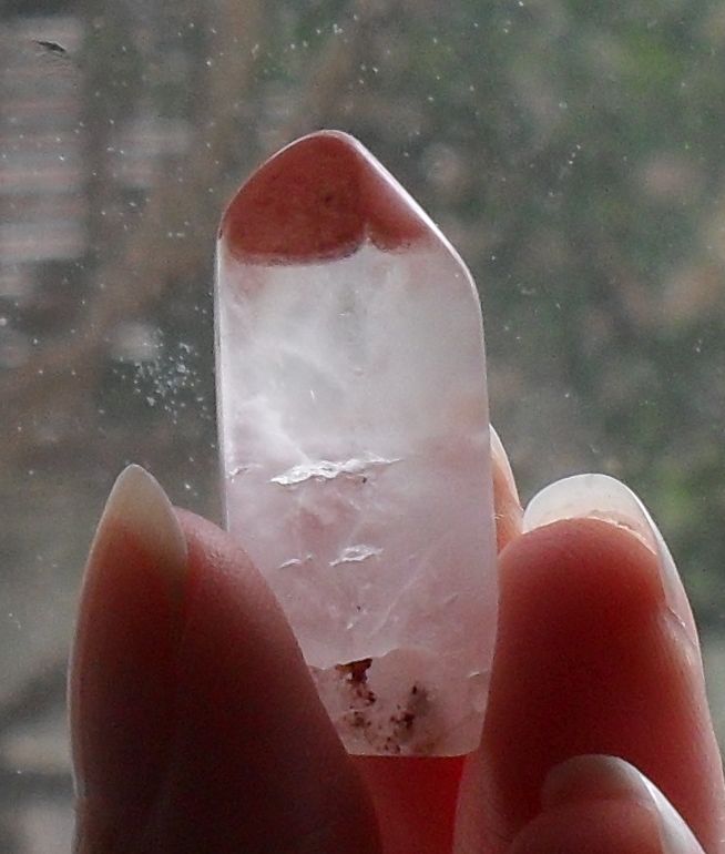 Als ich diesen Bergkristall auf Bildern gesehen habe (gekauft als Lithiumquarz), hätte ich ihn auch als "Lithium" identifiziert. Nun habe ich ihn leibhaftig vor mir, und ihn auch mit etwas besserem Licht erwischt, und überlege: Ist das eventuell kein Lithium sondern Hämatit?