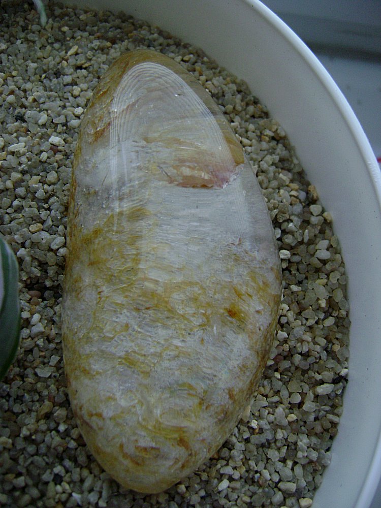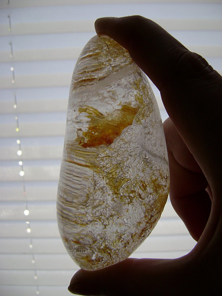 vor längerer zeit mal gekauft als bergkristall mit einschlüssen, aber was für welche? die unterseite ist übrigens nicht geschliffen und matt. das dritte foto täuscht auch etwas, denn er ist nicht so milchig wie er rüberkommt. er ist klar durchsichtig.