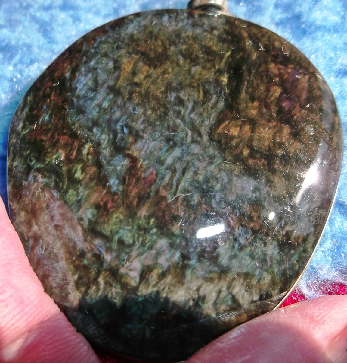 "Nach den bunten Farben der Huichol Indianern benannter Obsidian aus Mexico .Er besitzt ein faszinierendes irisierendes Farbenspiel , das je nach Lichteinstrahlung anders schimmert."