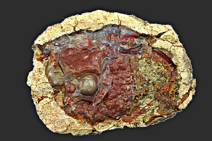 entwickelten sich dann Lagen von von Calcedon (gerade ,rund u.u.u.) unterschiedliche Mineralien in gelöster Form waren für die Bildung der Farben