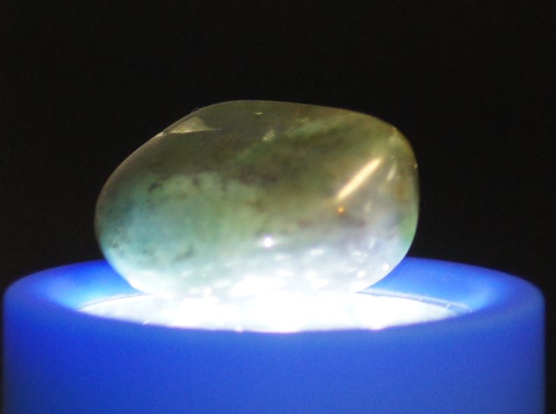 Dieser hier ist dunkelgrünlich-bläulich mit einem großen auffälligen hell-graublauen Fleck auf einer Seite und kleineren auf der Anderen.