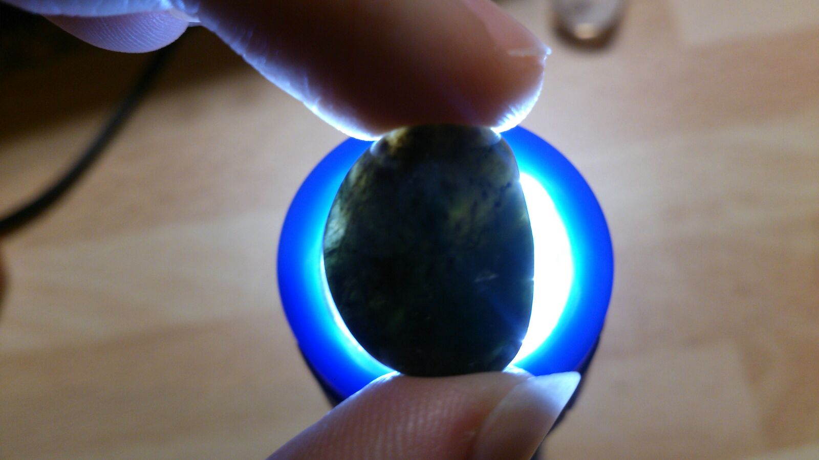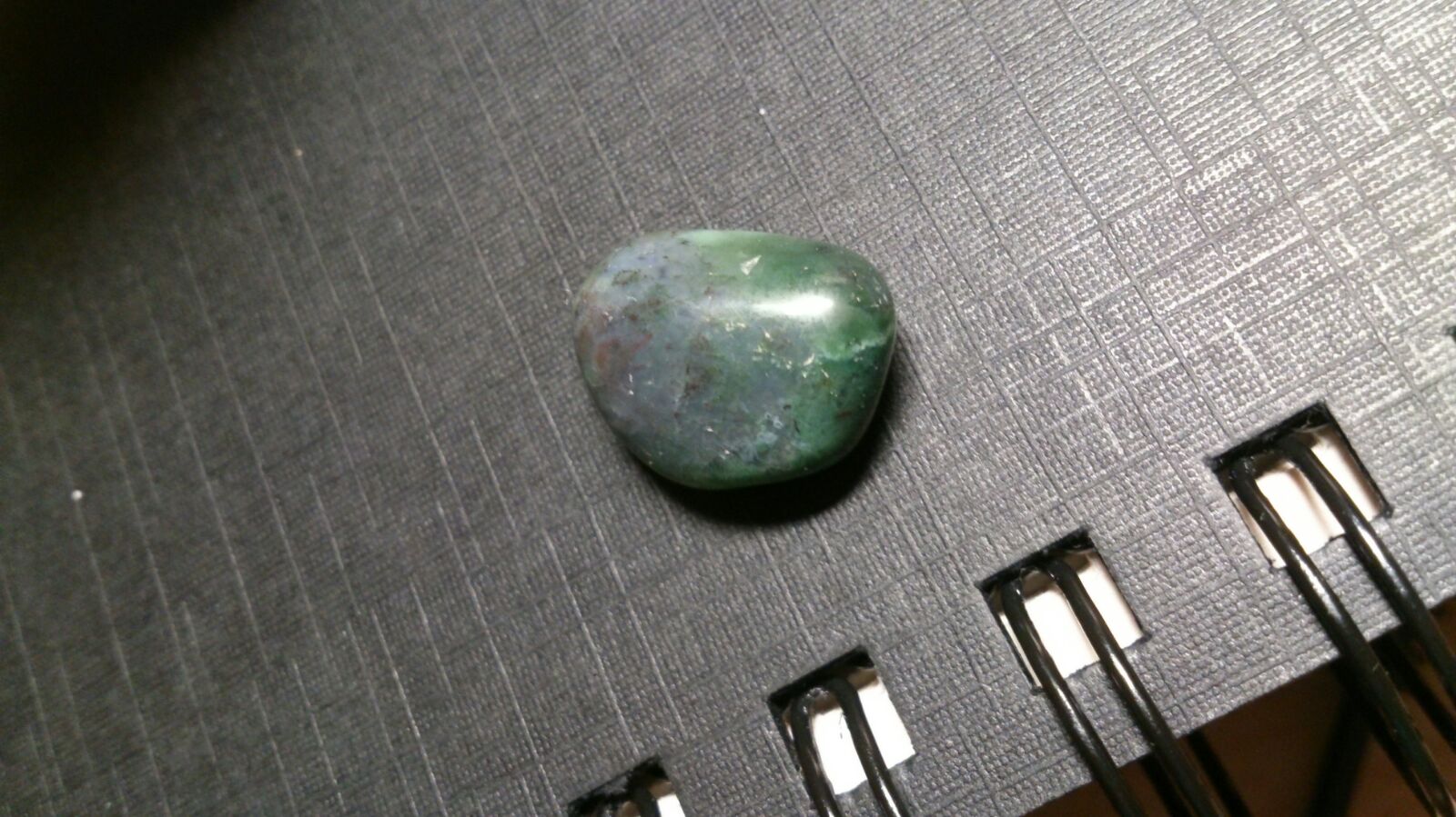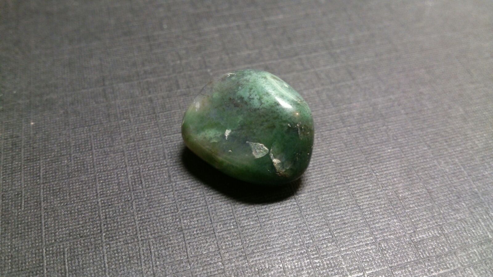 Dieser hier ist dunkelgrünlich-bläulich mit einem großen auffälligen hell-graublauen Fleck auf einer Seite und kleineren auf der Anderen.