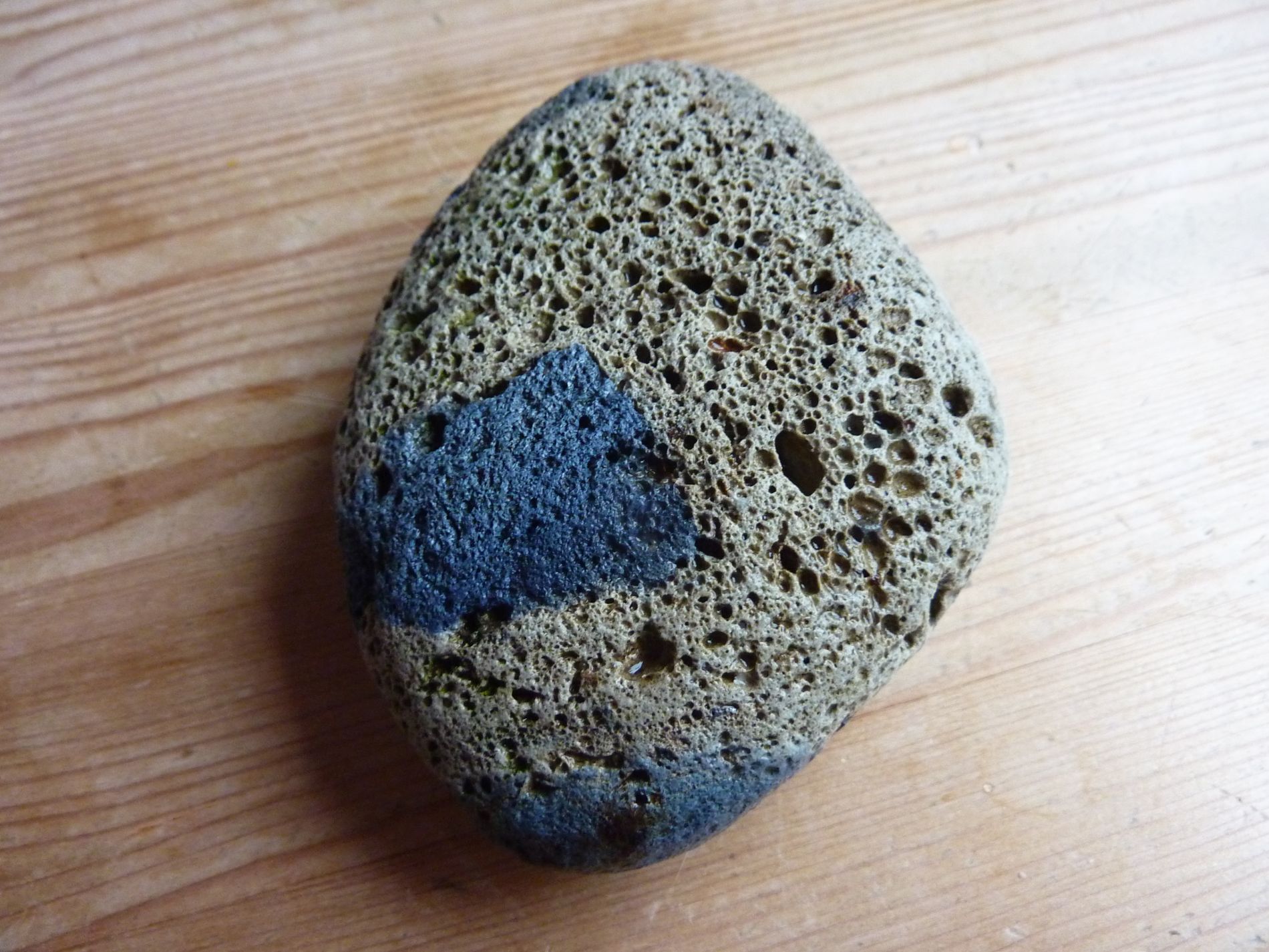 Fühlt sich an wie Bims, ist aber schwerer. Hat blaue Flecken.