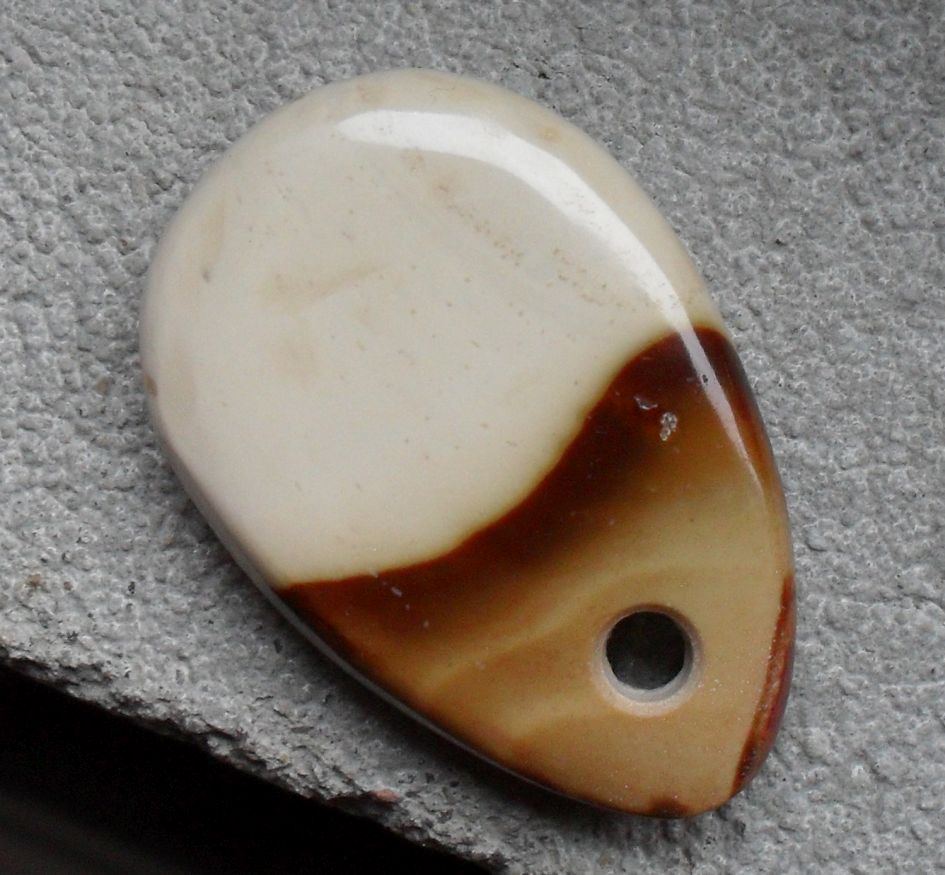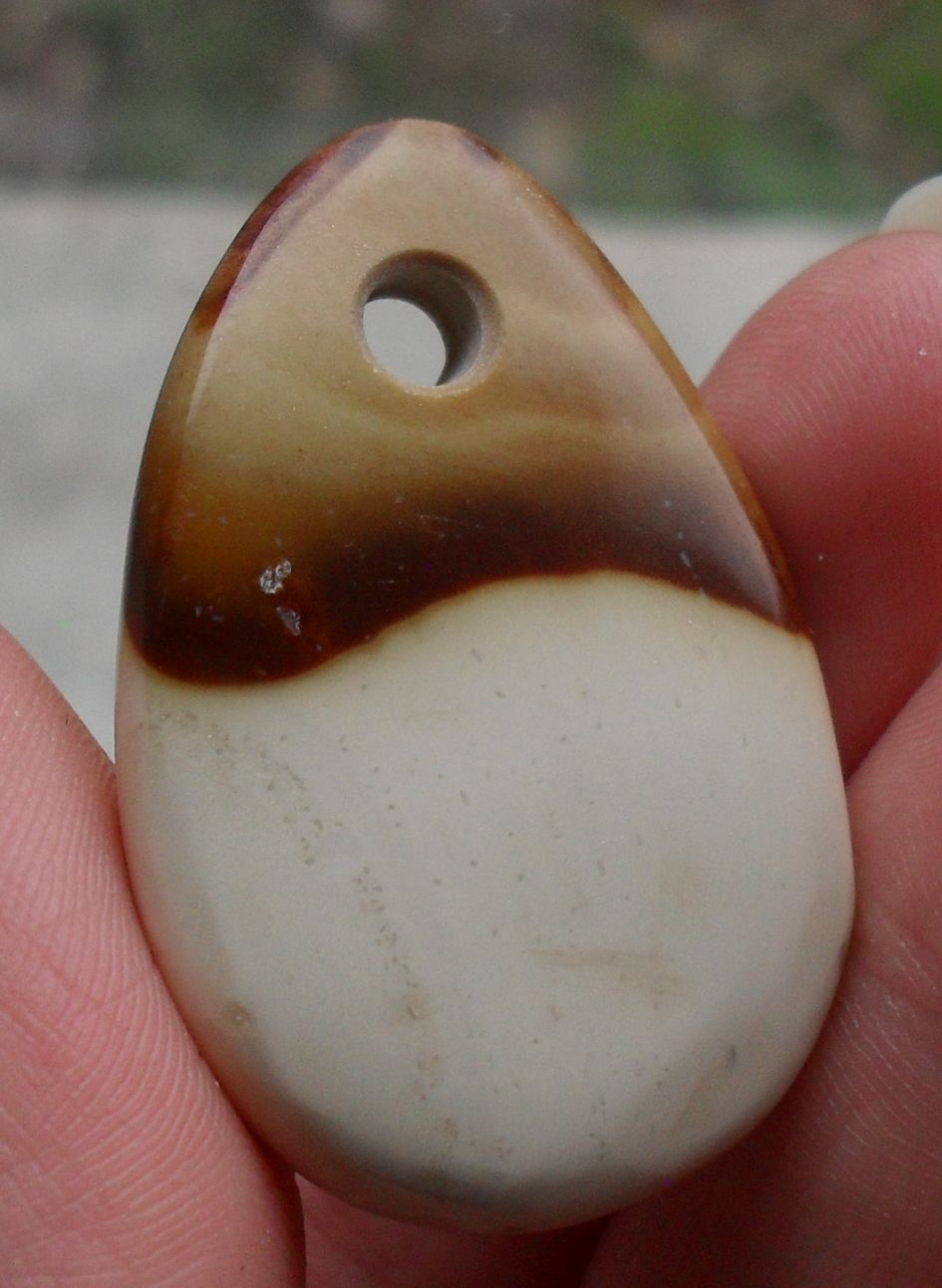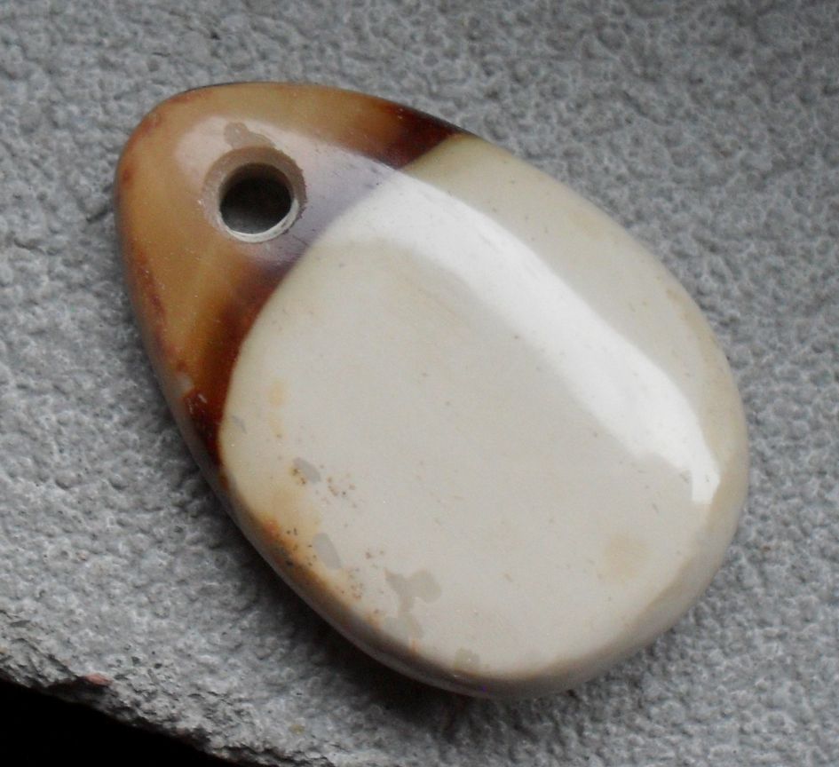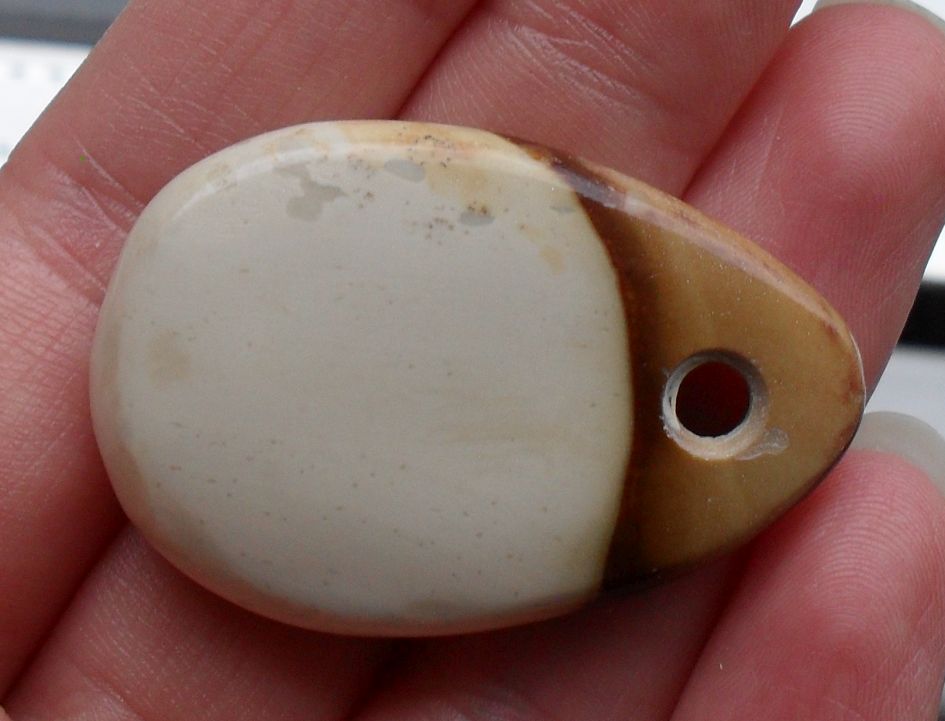 Ein rötlicher Fleck, ganz oben, oberhalb der Bohrung, erinnert mich spontan an manche Shiva lingam, sonst würde ich Richtung Jaspis (Auch Opalith wurde eingeworfen) tendieren. (Mit Quarz ritzbar.)