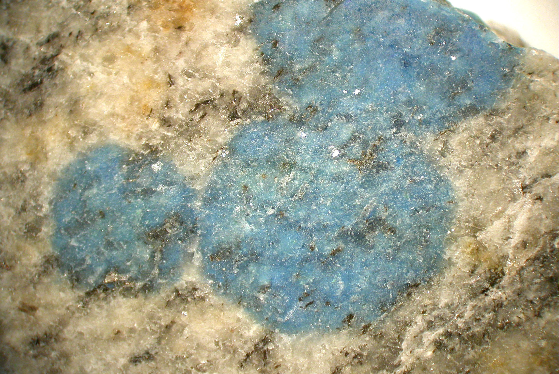 Epigem hat das wohl mal untersucht und bestätigte dass es Azurit in Granit ist, es waren auch Spuren von Malchit zu finden. Beim Googlen nach der genauen Herkunft in einem anderen Forum gefunden.