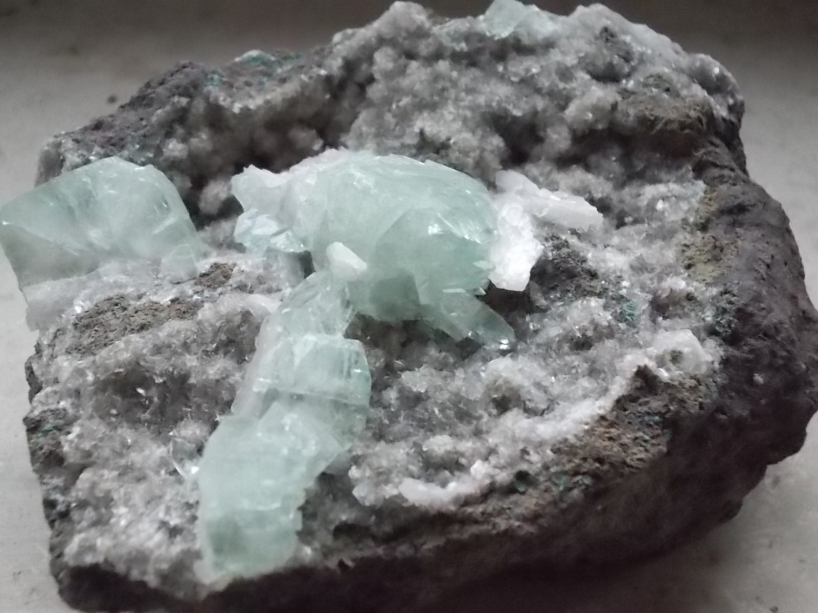 Die Kristallgrünen ist glaube ich ziemlich sicher Apophylit (habe ich erst kürzlich endlich einen gefunden +++# den ich noch extra präsentiere), aber auf was?