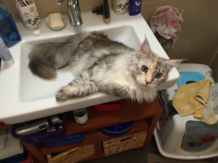 Im Frühling 2015 hatte ich eine Gedanke, es ging um ein Katzen Mädchen am Liebsten vom Bauernhof in der Farbe schwaz/weiß. Schon in meinen Träumen habe ich sie gesehen. Meine Gedanken habe ich dann meinem Freund erzählt und er war gleich infiziert. Nun wie auch Männer sind, hat er dies auch einer gute Freundin erzählt, deren Mutter eine Maincoon Züchterin ist (so jetzt kennt Ihr die Rasse). Ich sagte dann zu meinem Freund: Amore das sind Langhaarkatzen die Haaren genau soviel wie die zwei die wir schon haben dass gibt noch mehr Arbeit. Er meinte dann, schauen kostet ja nichts. Ja genau dachte ich :lol: , der verliebt sie in die kleine Katze wie der Blitz. ++"# .