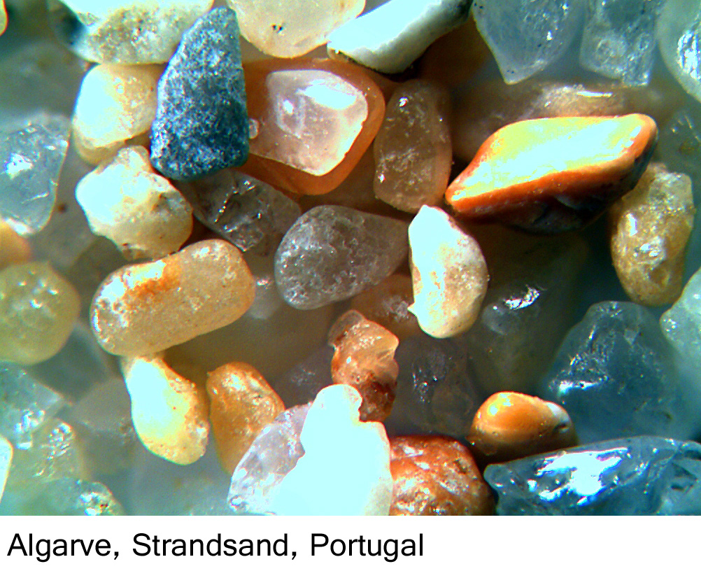 die letzten Bilder wurden mit einem Flachbettscanner aufgenommen. Zur Vorlage dienten Mini-Trommelsteine in durchschnittliche Größe von 2-4mm. Diese neueste Abbildung wurde aus vier Mikroaufnahmen zusammengesetzt. Der Sand war für den Scanner zu fein, hat aber eine interessante Zusammensetzung. Besonders fällt der hohe Anteil an OLIVIN auf. Es wäre also sicher dem Wohlbefinden bekömmlich in diesem Sand öfter Sonnenbäder zu nehmen. Nur wie kommen wir regelmäßig nach HAWAII?